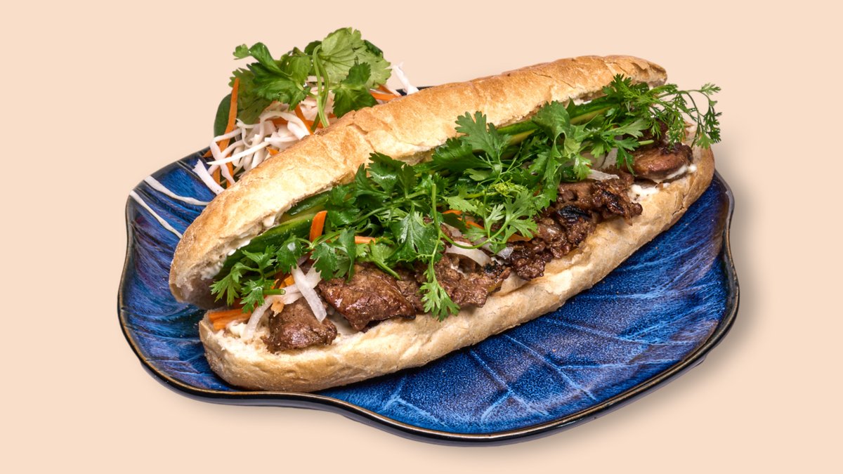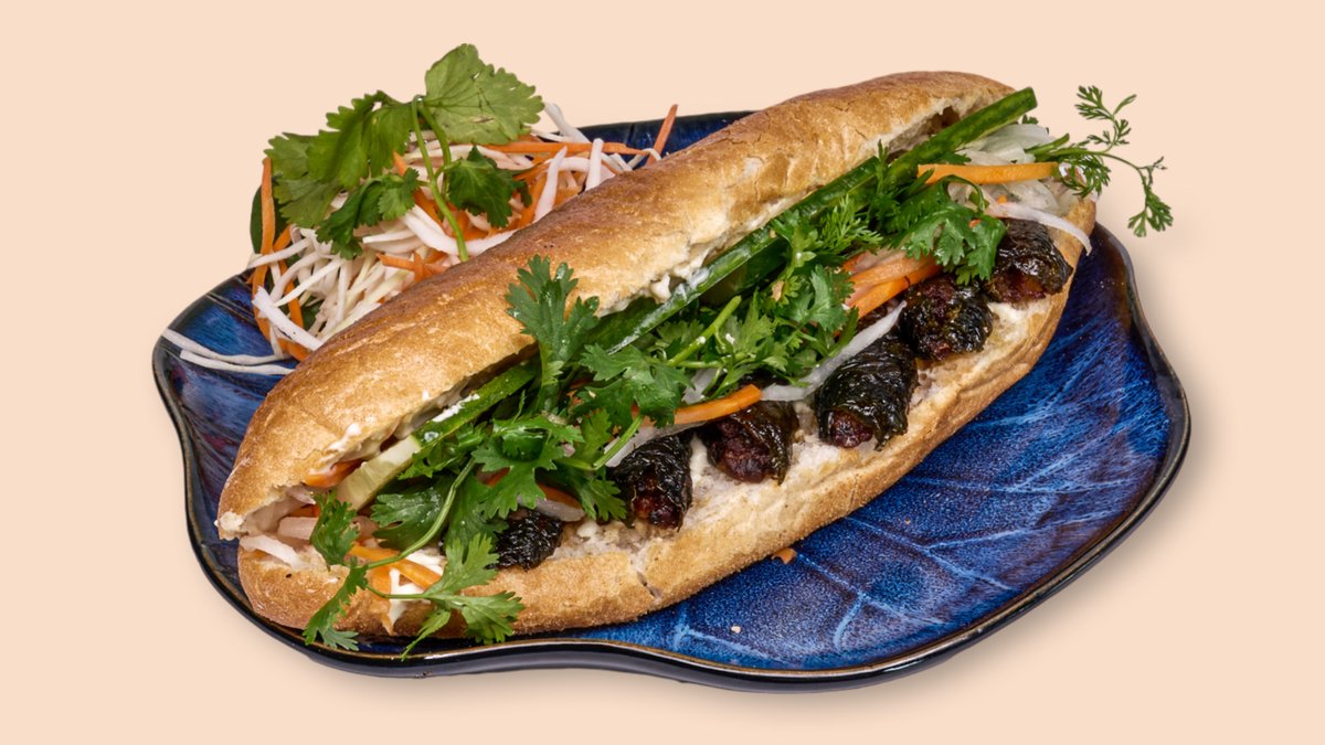 alle Gerichte werden mit Baguette, eingelegtem Karotten-Rettich-Mix, Koriander, Gurken und veganer Mayonnaise zubereitet und mit Krabbenchips serviert