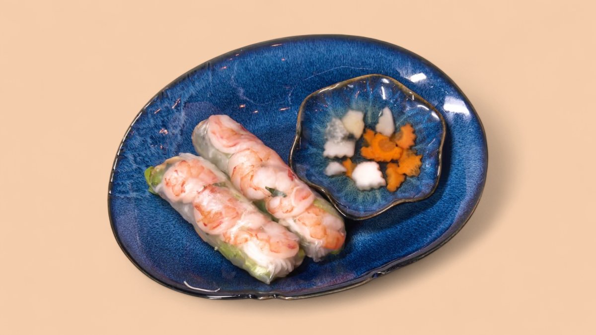 zwei Reispapierrollen gefüllt mit Reisnudeln, Omelette, vietnamesischen Kräutern und vietnamesischer Vinaigrette dazu einer Zutat deiner Wahl