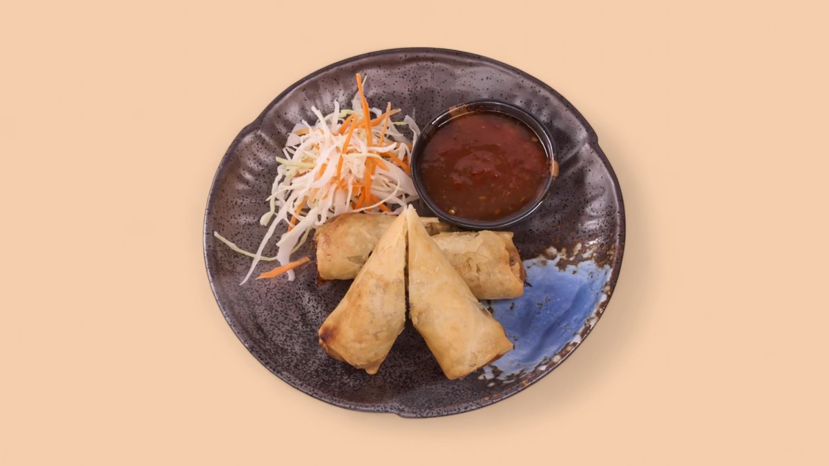 zwei frittierte Frühlingsrollen gefüllt mit Gemüse, Morcheln und Glasnudeln, mit süß-saurer Soße