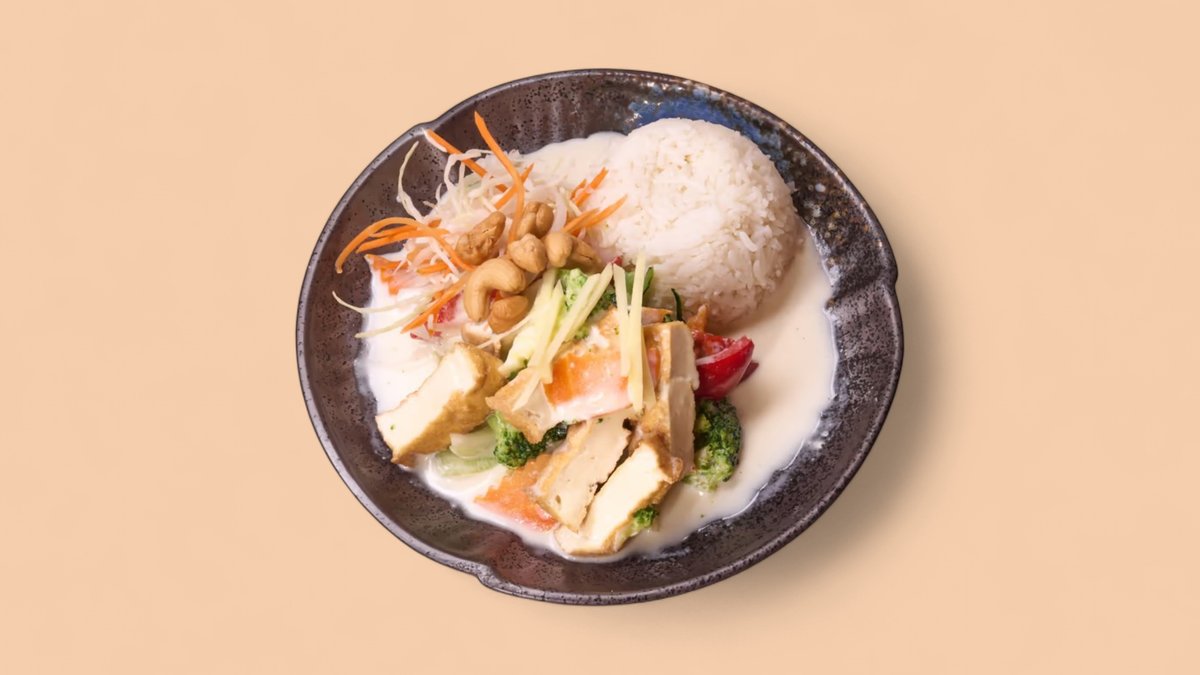 Tofu gekocht in Kokosmilch mit Ingwer, Cashewkernen und Gemüse