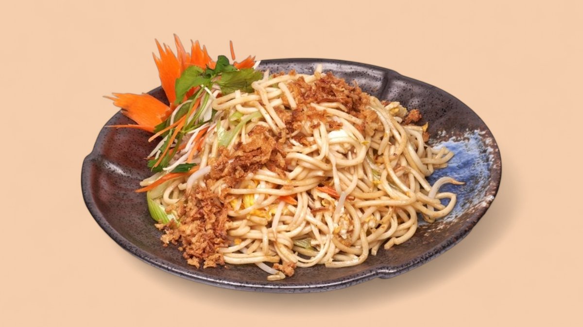 gebratene Eiernudeln mit Gemüse und Röstzwiebeln