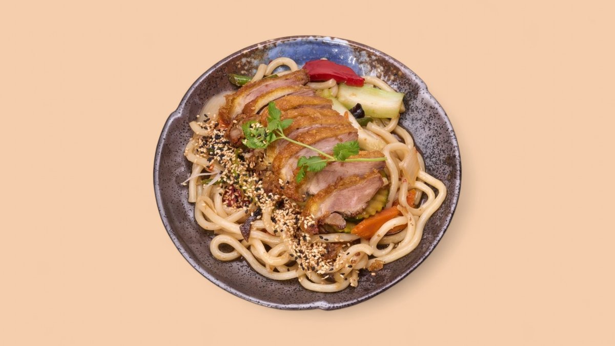 dicke Weizennudeln gebraten mit Gemüse, Pak Choi und krossen Entenfleisch