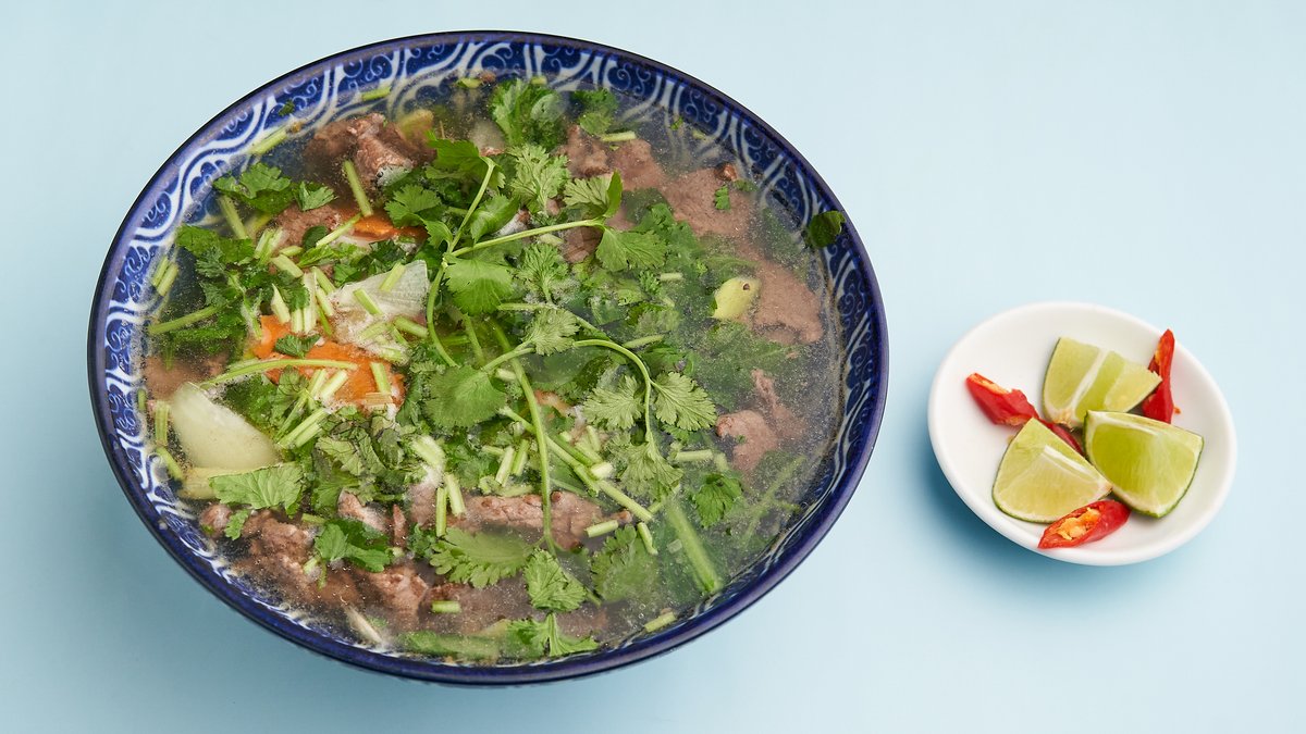 Reisbandnudelsuppe mit gebratenem Rindfleisch in Gewürzbrühe, Ingwer, Lauchzwiebeln und verschiedenen vietnamesischen Kräutern
