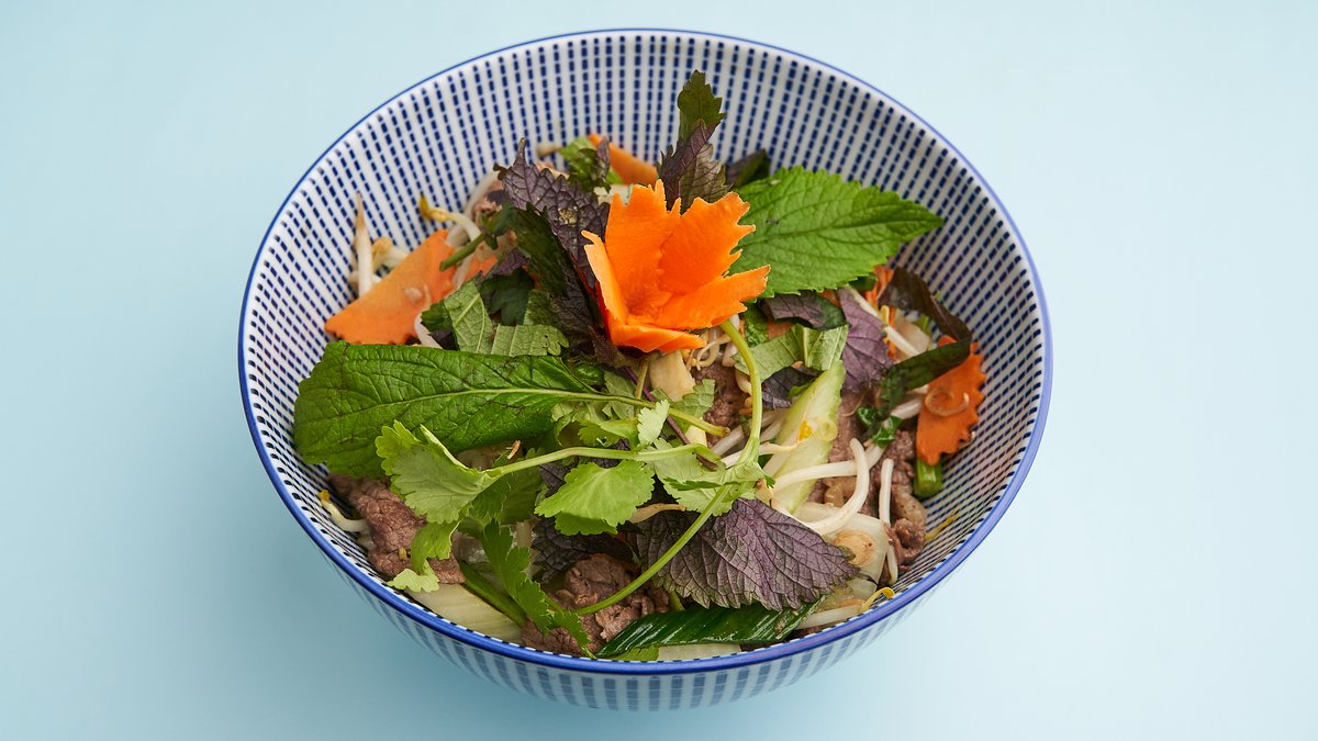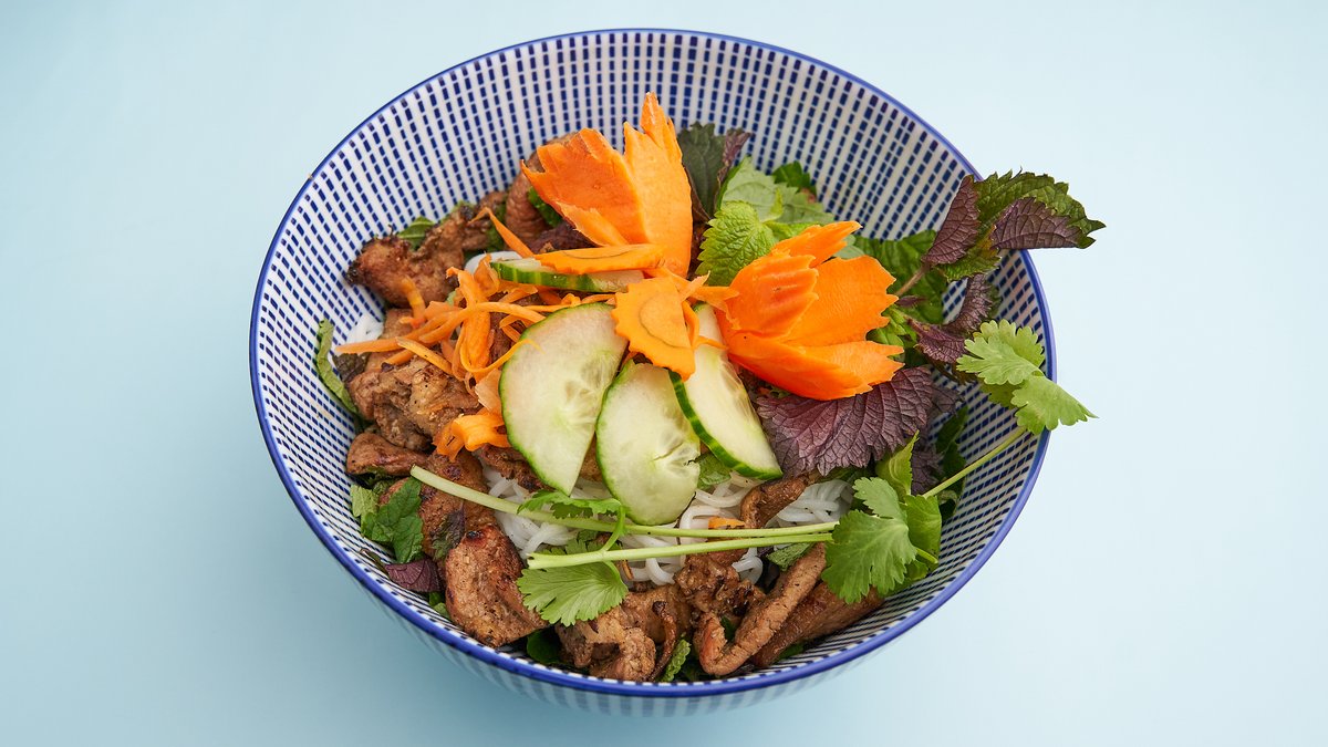 lauwarme Reis-Fadennudeln mit geröstetem Knoblauch, Gemüse, Zitronengras, gebratenem Rindfleisch, vietnamesischen Kräutern, Salat, Erdnüssen, Nuoc Mam Soße und einer Zutat deiner Wahl