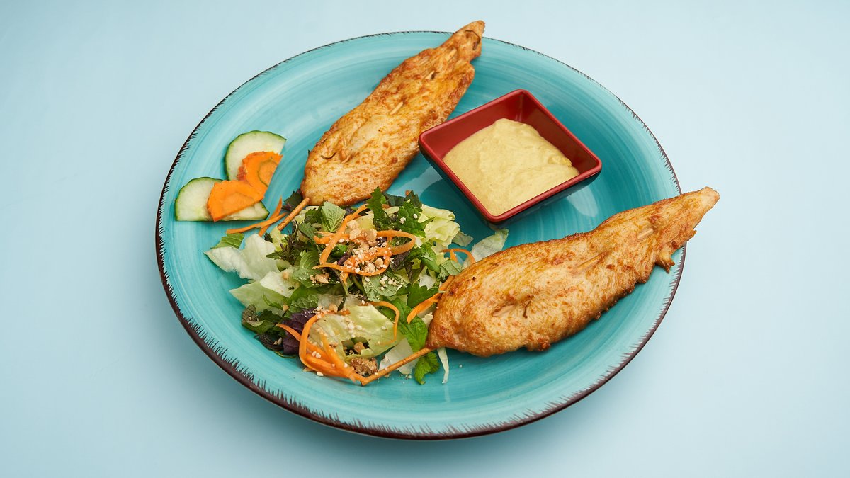 2x Hähnchenspieße mit Salat und Erdnusssoße, auf Wunsch auch vegan möglich