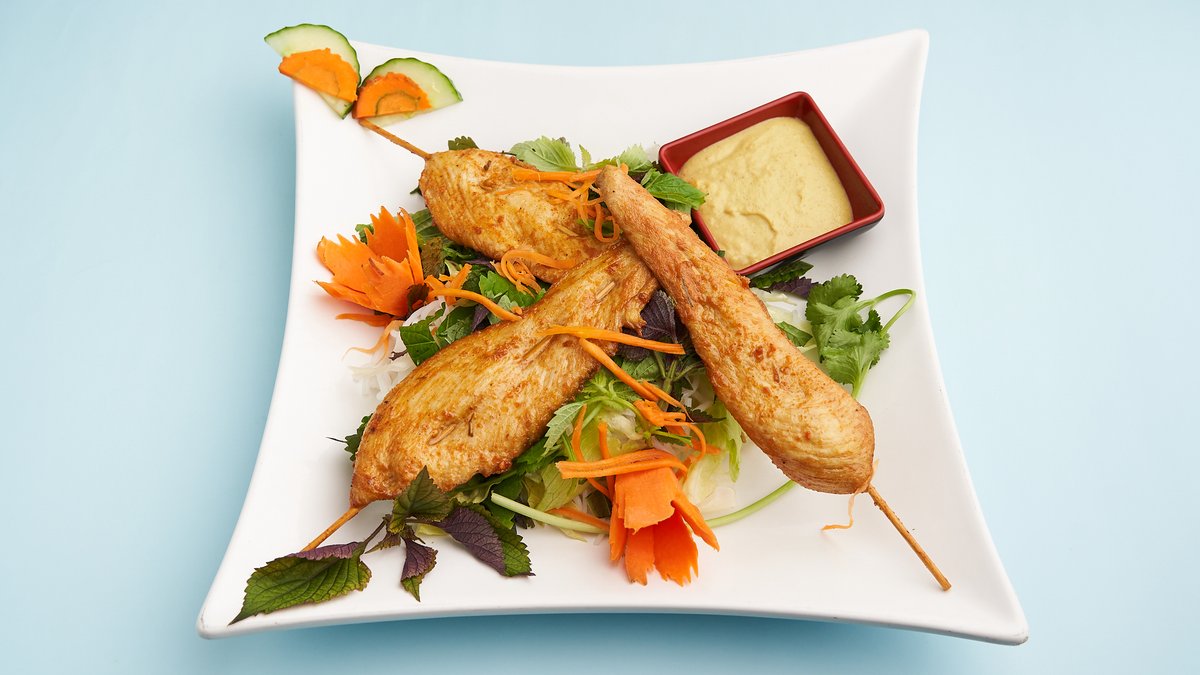 lauwarme Reis-Fadennudeln mit gewürztem Sa Te, gewürzten Hähnchenspießen, Salat, Kräutern, Nuoc Mam Soße, Erdnusssoße und einer Zutat deiner Wahl