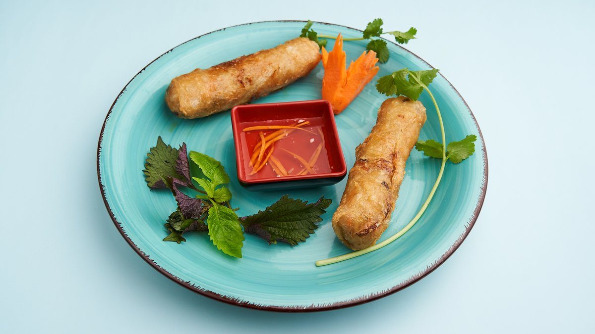 2x Frühlingsrollen mit gehacktem Schweinefleisch, Glasnudeln, gebratenem Gemüse und Nuoc Mam Soße, auf Wunsch auch vegan möglich
