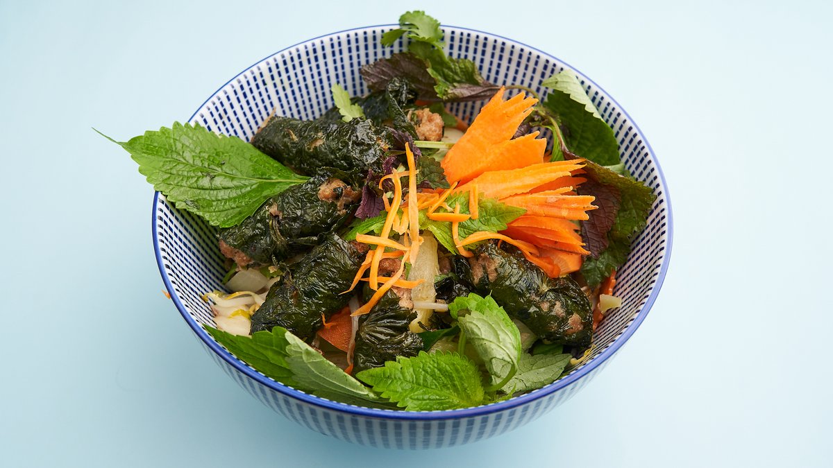lauwarme Reis-Fadennudeln mit gefülltem Schweinefleisch in Blättern, verschiedenen vietnamesischen Kräutern, Salat und Nuoc Mam Soße