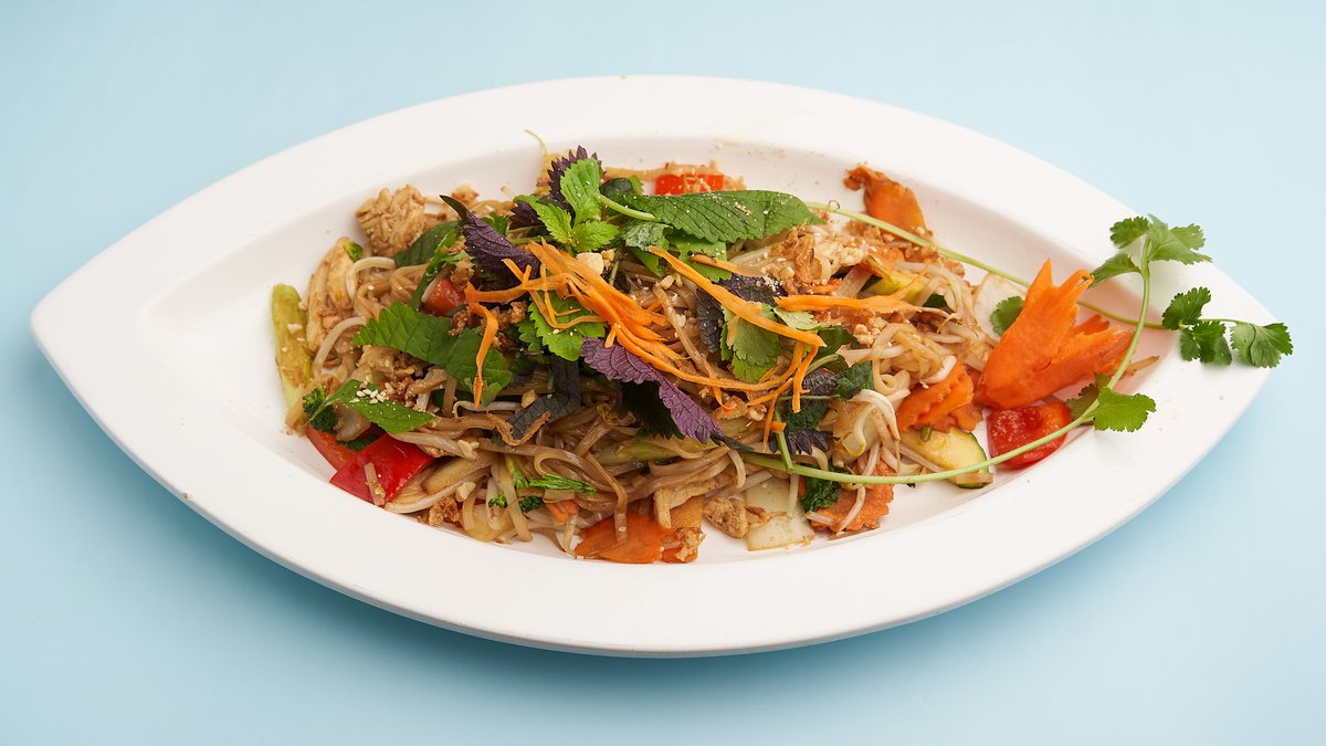 gebratene Reis-Bandnudeln mit Gemüse, Erdnüssen, Sesam und einer Zutat deiner Wahl
