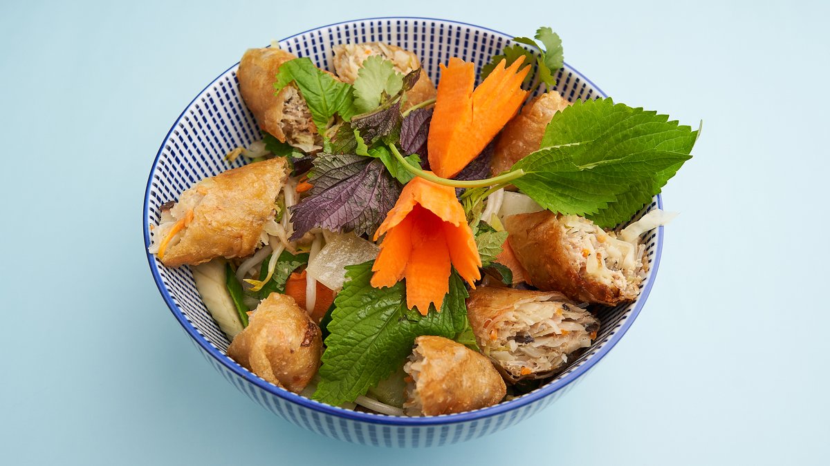 lauwarme Reis-Fadennudeln mit gebratenen Frühlingsröllchen, vietnamesischen Kräutern, Salat, Nuoc Mam Soße und einer Zutat deiner Wahl