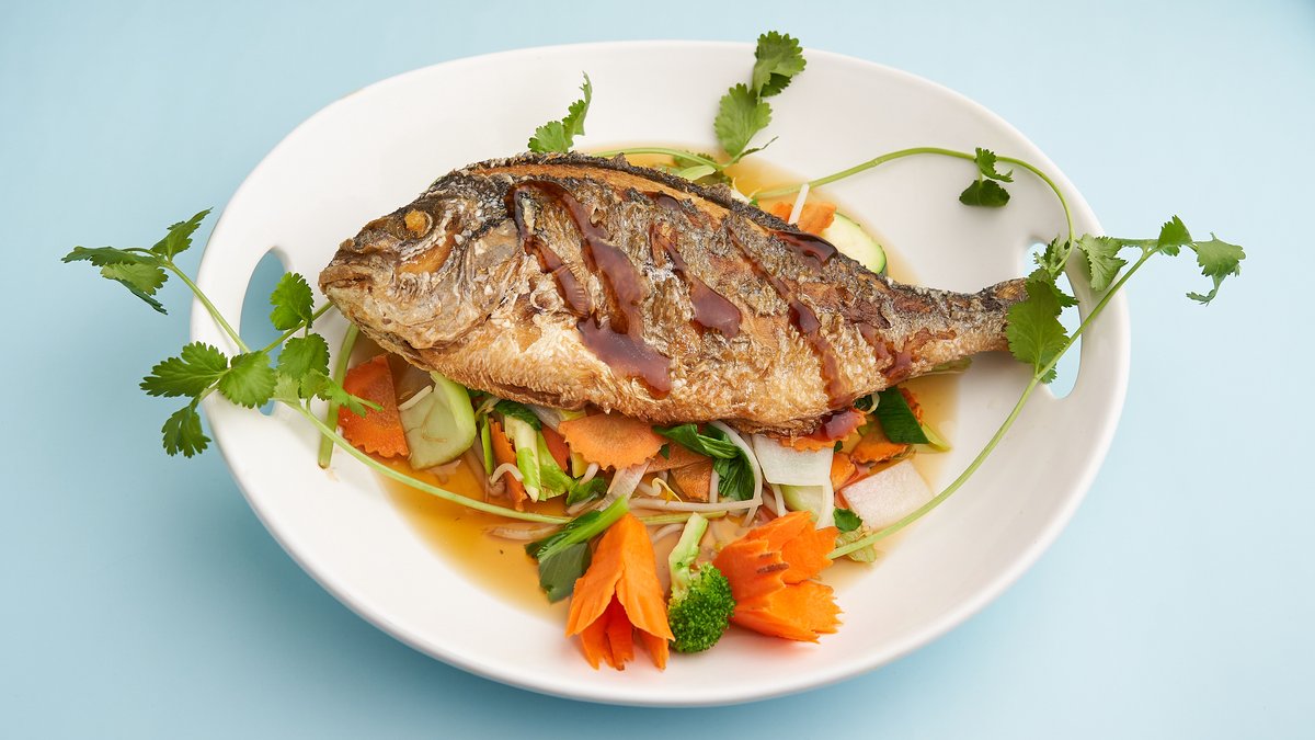 gebratene Dorade mit Knoblauch, Chili und Gemüse