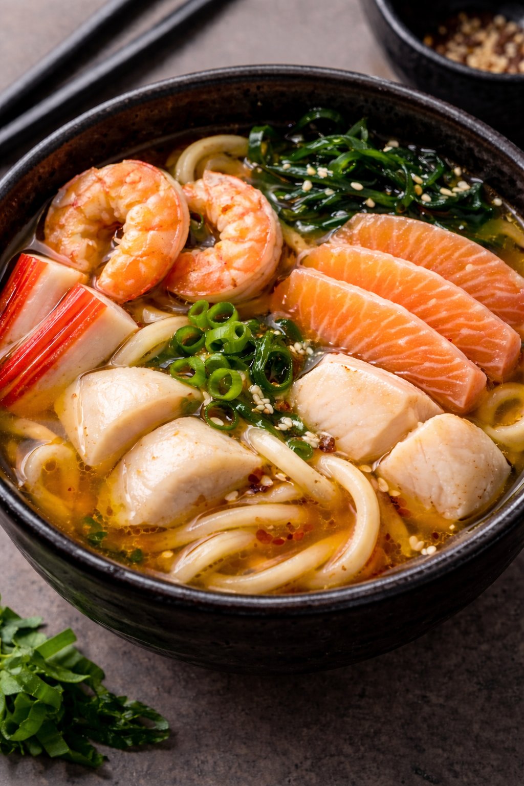 Aromatische Seafood- Udon -Suppe getoppt mit Meeresfrüchten