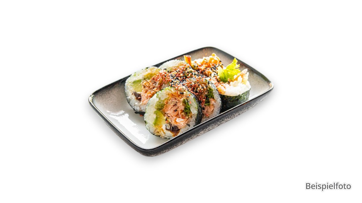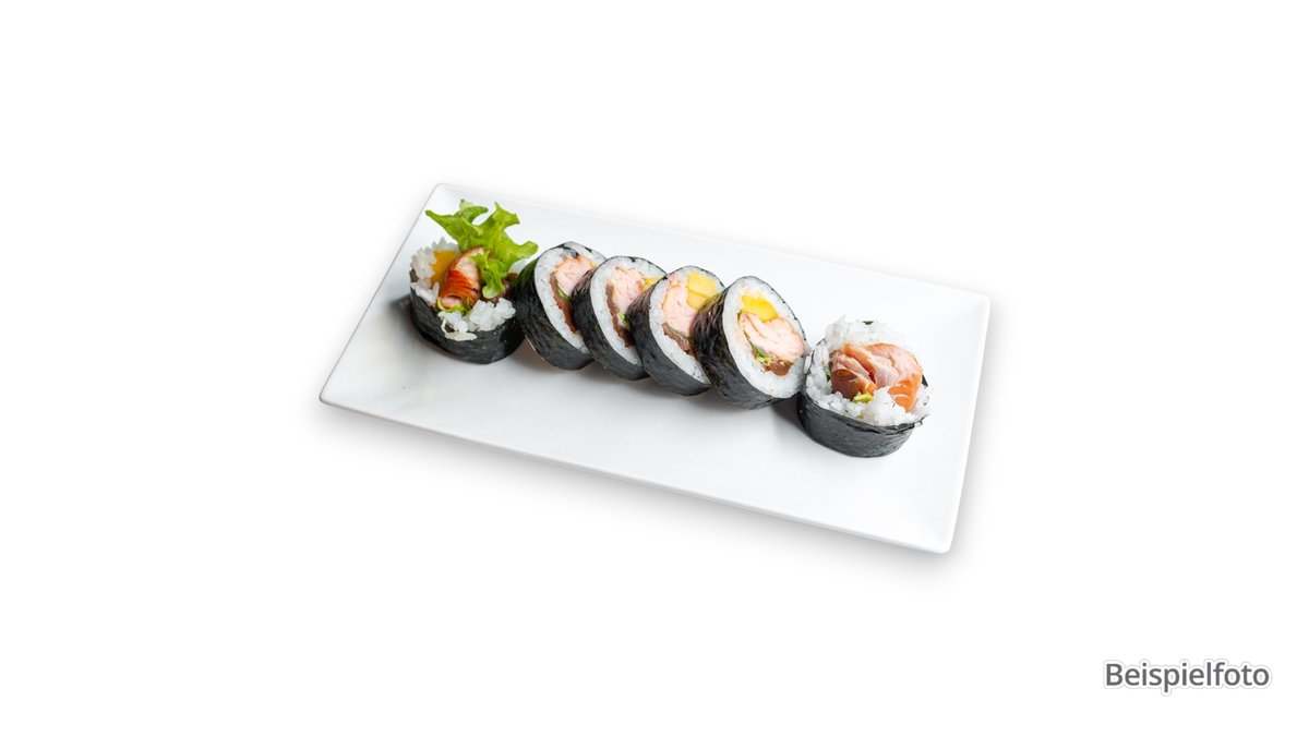 6x Salmon Crunchy Roll 6x Mutsu Maki 1x Lachs Nigiri 1x Thunfisch Nigiri 1x Unagi Nigiri 1x Butterfisch Nigiri
