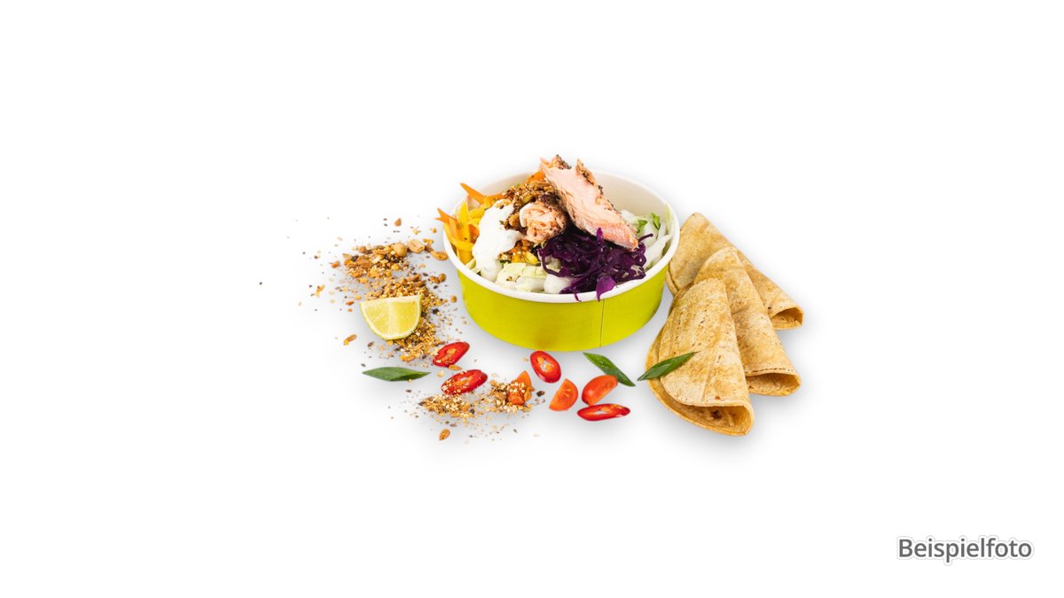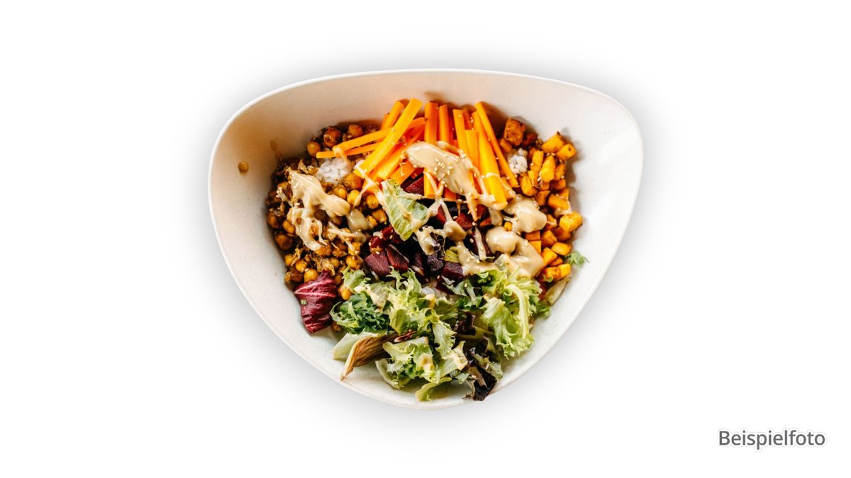mit Gemüse der Saison, frischen Kräutern, Salat-Mix, Sesam, hausgemachter Teriyaki-Soße, Jasmin-Duftreis und einer Zutat deiner Wahl