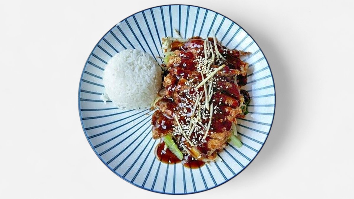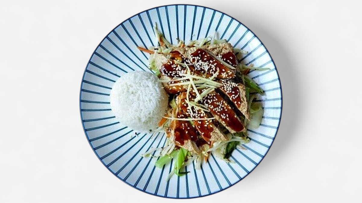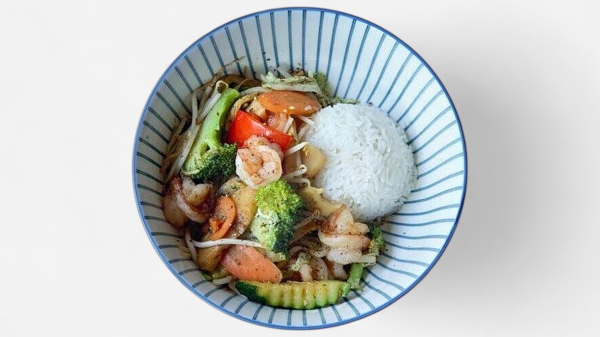alle Gerichte werden mit Reis, Karotten, Zucchini, Sojasprossen und einer Zutat deiner Wahl zubereitet („Barbecue Reis“ wird ohne Zucchini zubereitet und „Curryreis“ wird ohne Sojasprossen zubereitet)