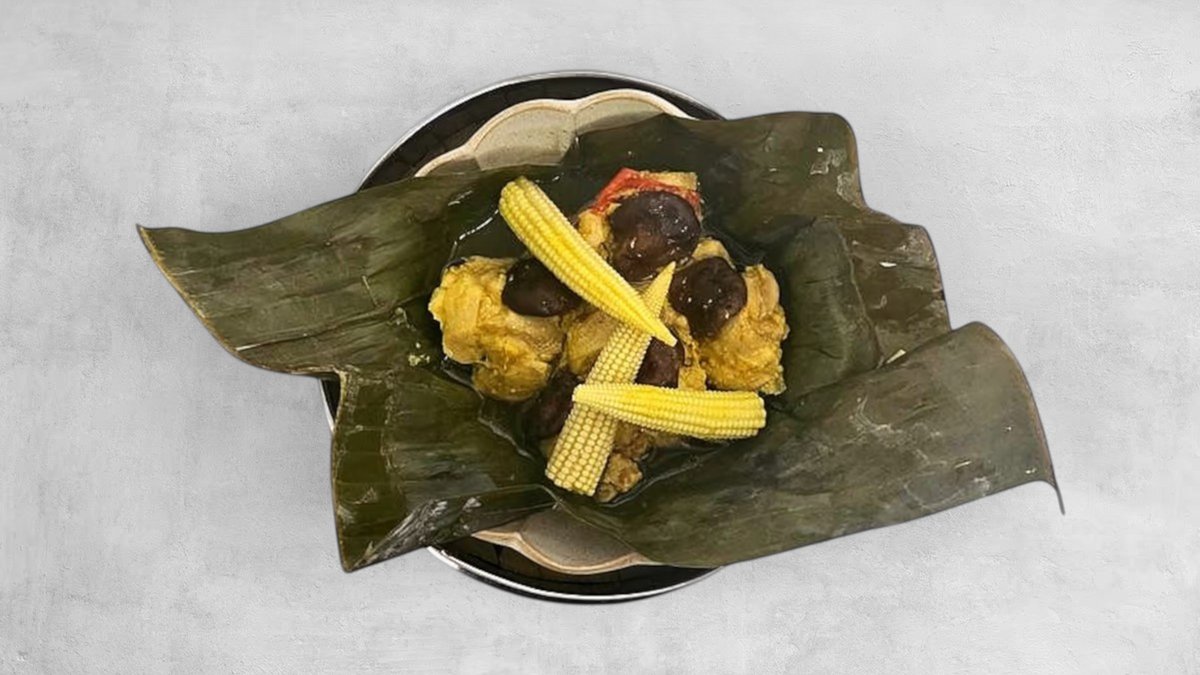 gedämpftes Hähnchensteak aus der Keule mit Zitronengras, Ingwer und Chili im Bananenblatt, dazu Babymais, Shiitake und Duftreis