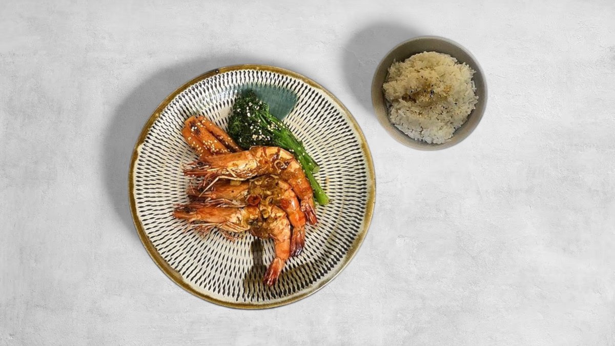 Gegrillte Black Tiger Garnelen in Chili-Zitronengras-SoĂźe mit frischem GrillgemĂĽse und Reis