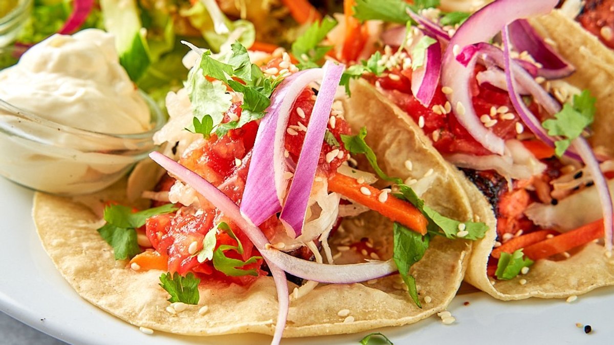 vier Weizen Tacos mit Tandoori-Lachs, Salsa, Chilisoße, Krautsalat, Salat, Creme Fraiche und Guacamole