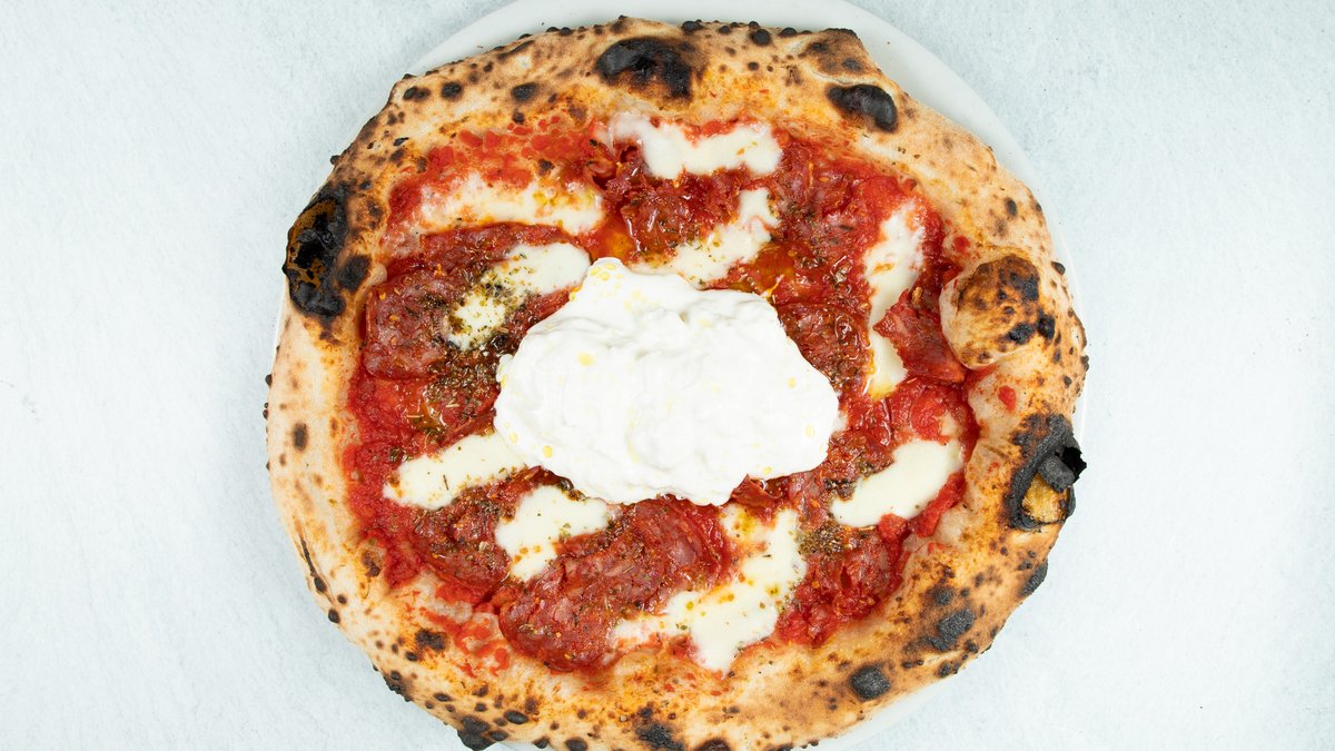 Tomatensoße, Fior di Latte IGP, scharfe Salami, Stacciatella Käse, Oregano, Parmigiano und Chiliöl