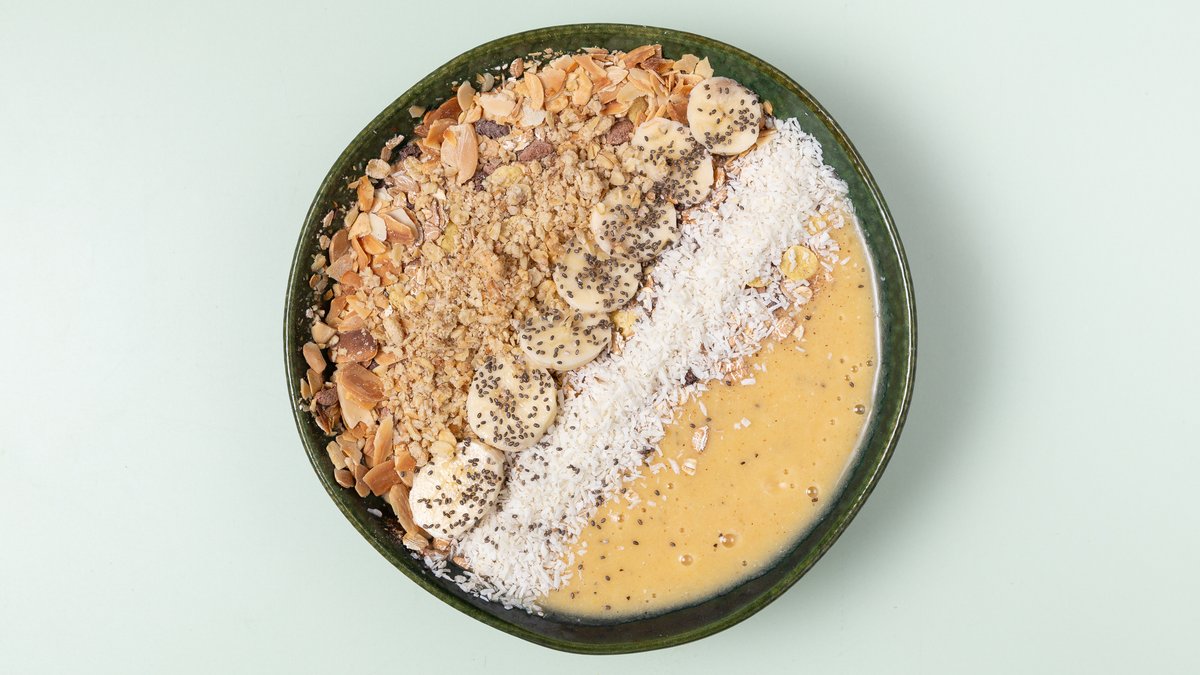 aus Banane, Passionsfrucht, Mango, Pfirsich, DattelpĂĽree und Kokosmilch