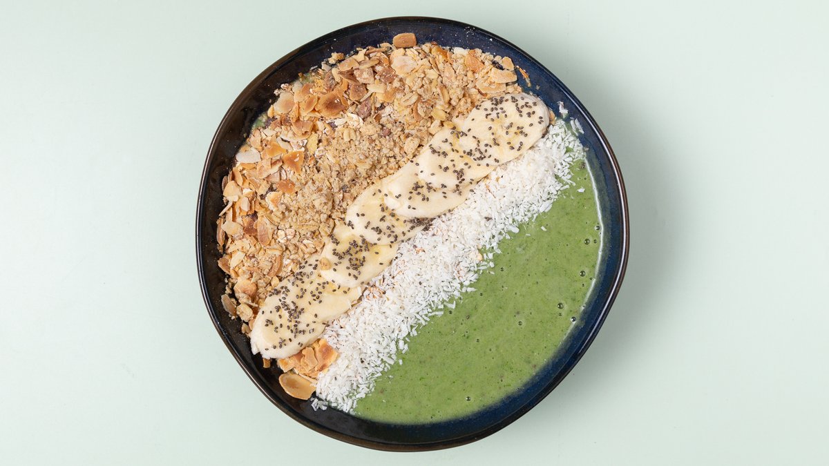 aus Banane, Spinat, Mango, Ananas, Erbsenproteinp ellets und Chiasamen