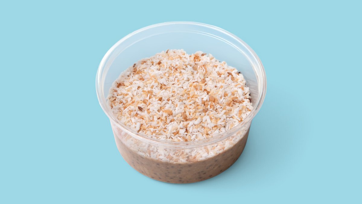 mit Erdnussbutter, Chia, Ahornsirup, Haferflocken und Kokosflocken und eine Milchsorte deiner Wahl