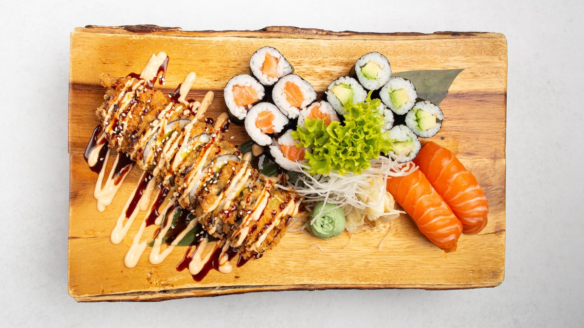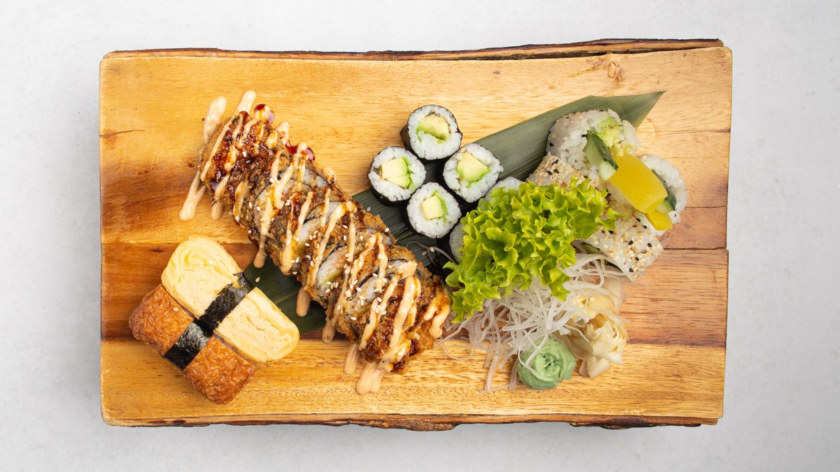 Unagi, Garnelen, Lachs, Avocado, Masago und Käse
