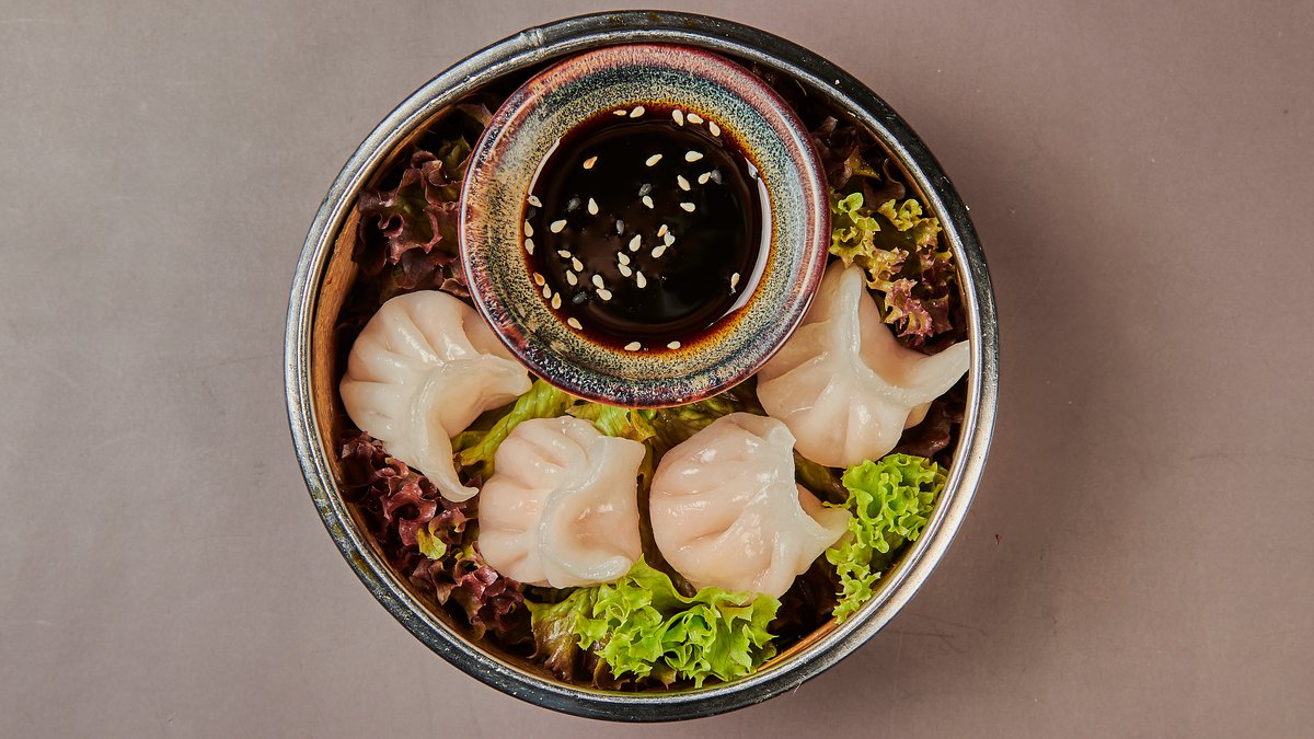 4 StĂĽck frittierte Teigtaschen gefĂĽllt mit Garnelen, HĂĽhnerfleisch und Pilzen, serviert mit Sweet-Chillisoáşže