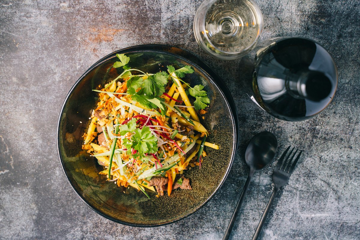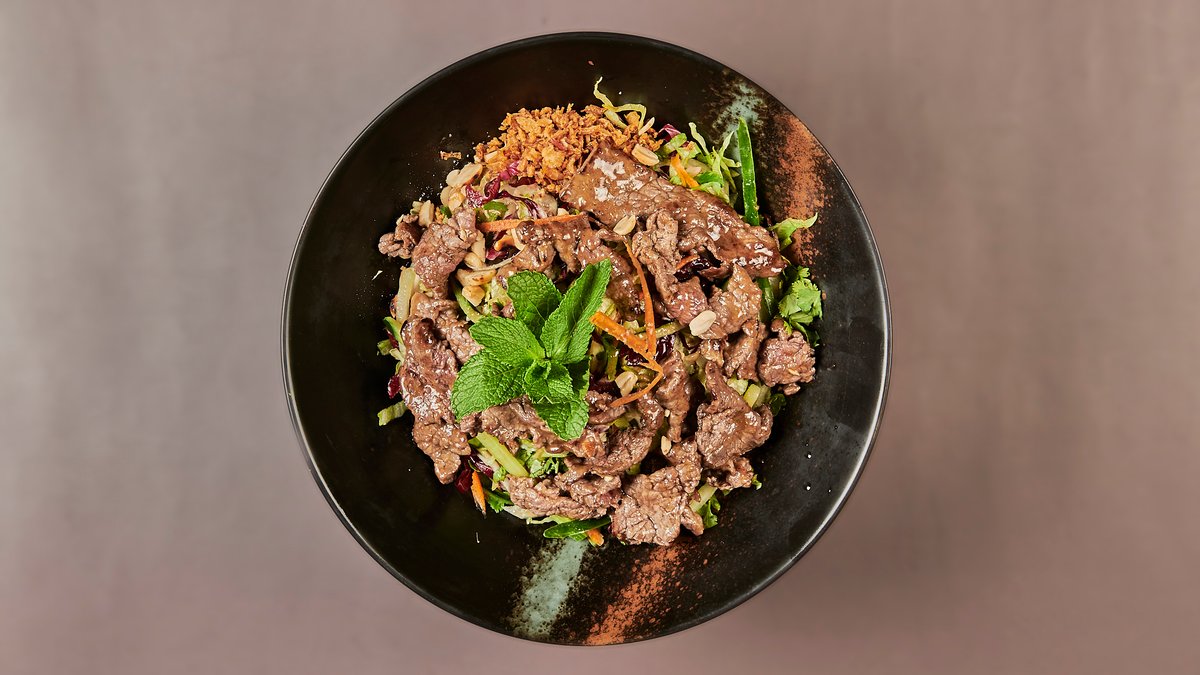 frische Mangostreifen mit Sojasprossen, Karotten, Koriander, ErdnĂĽsse, hausgemachtem Dressing und Zutat nach Wahl