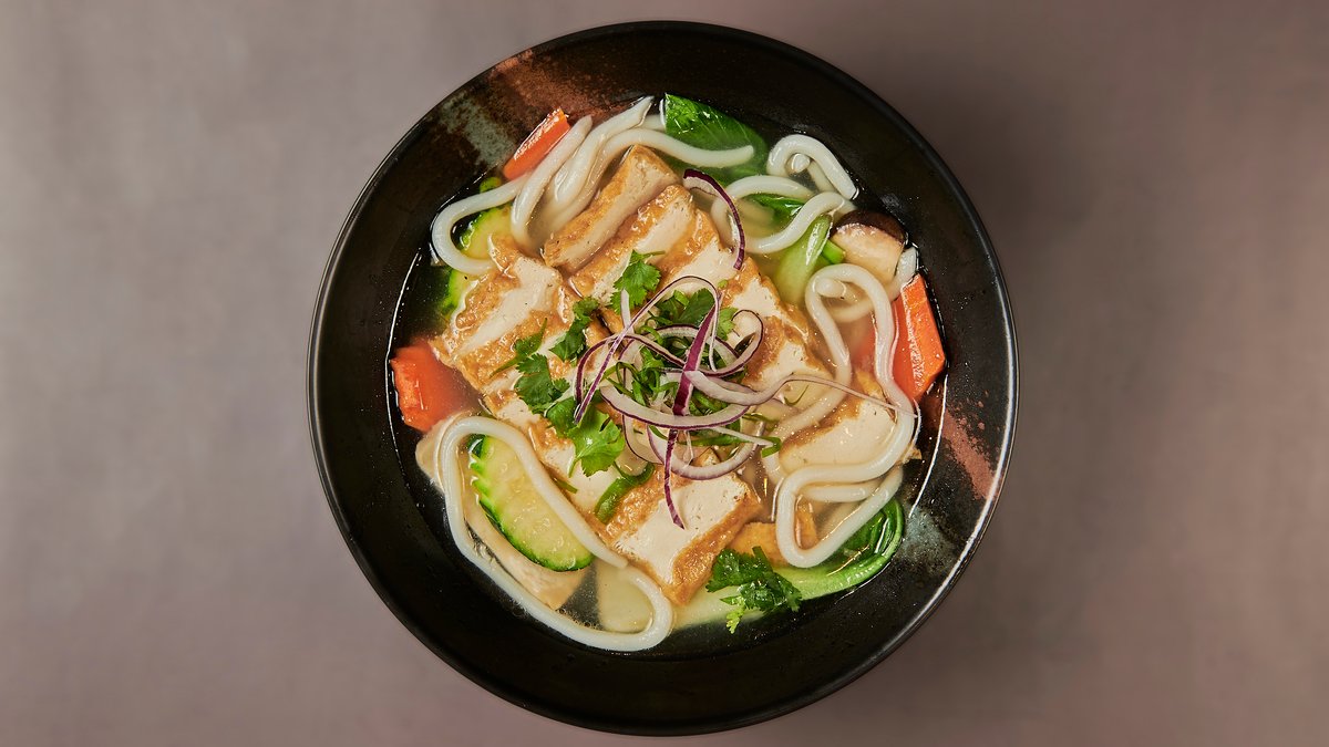 gebratene japanische Udon-oder Ramen-Nudeln mit SaisongemĂĽse, Spiegelei und Teriyaki-SoĂźe mit Zutat nach Wahl