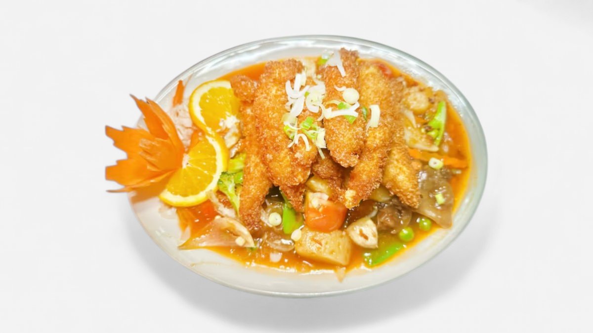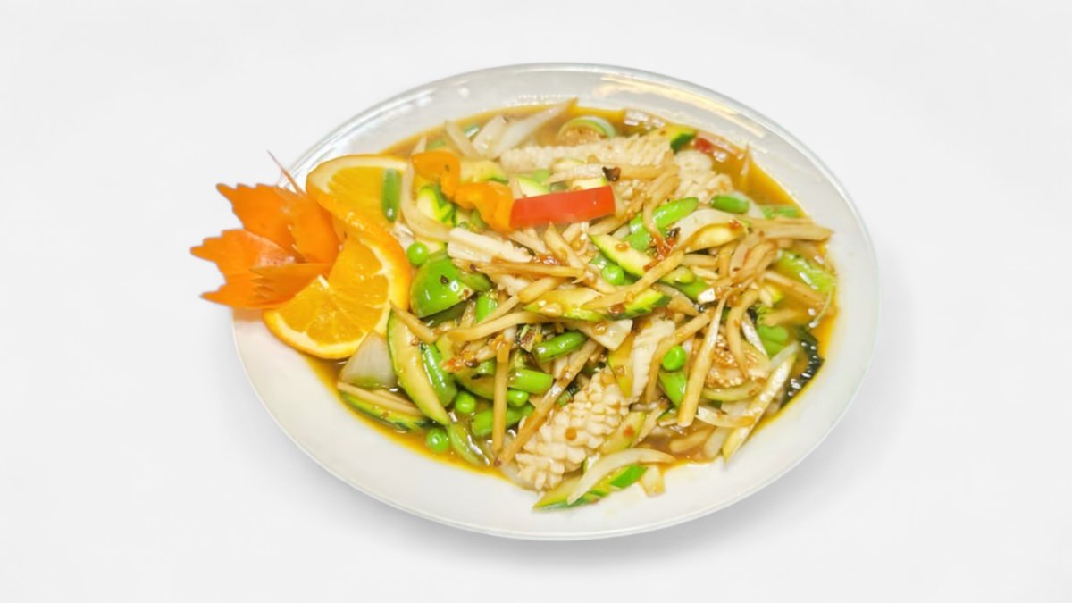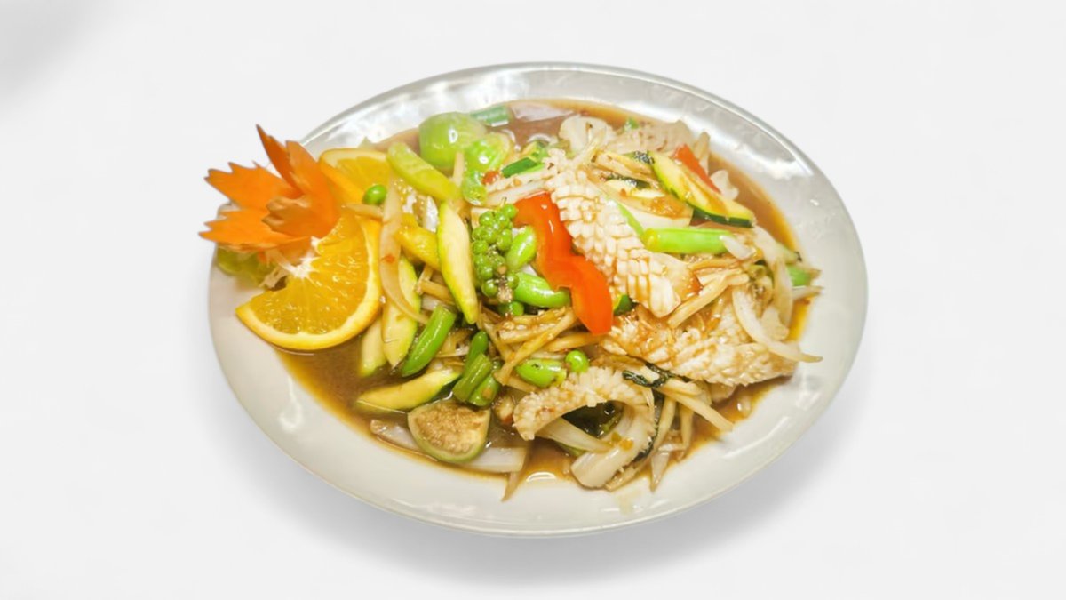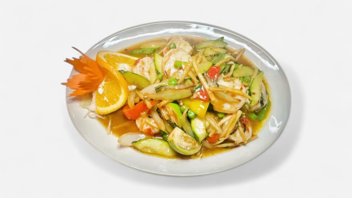alle Gerichte werden mit gebratenem Gemüse, Thai-Kräutern und Knoblauch zubereitet („50. Gung Priau Wahn” wird ohne Thai-Kräuter und Knoblauch zubereitet ), Reis als Beilage