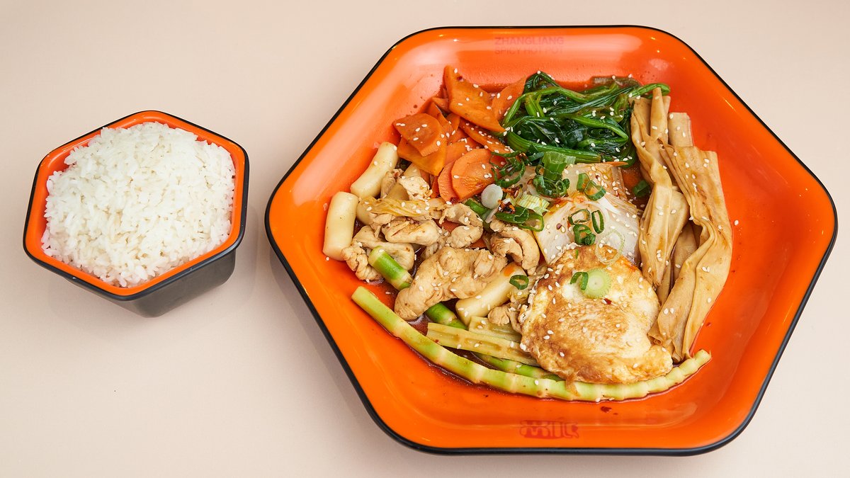 scharf, für 2 Personen 2x Woktopf mit 2x Schüsseln Reis