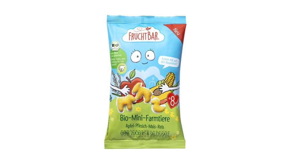 FruchtBar BIO Mini-Farmtiere Apfel, Pfirsich, Mais, Reis