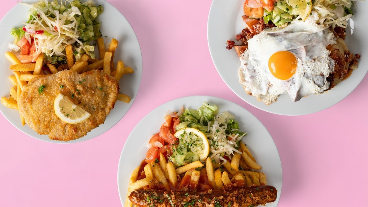 Leberkäse, Senfdip, Salat, Coleslaw, Röstzwiebeln, Tomate und Spiegelei