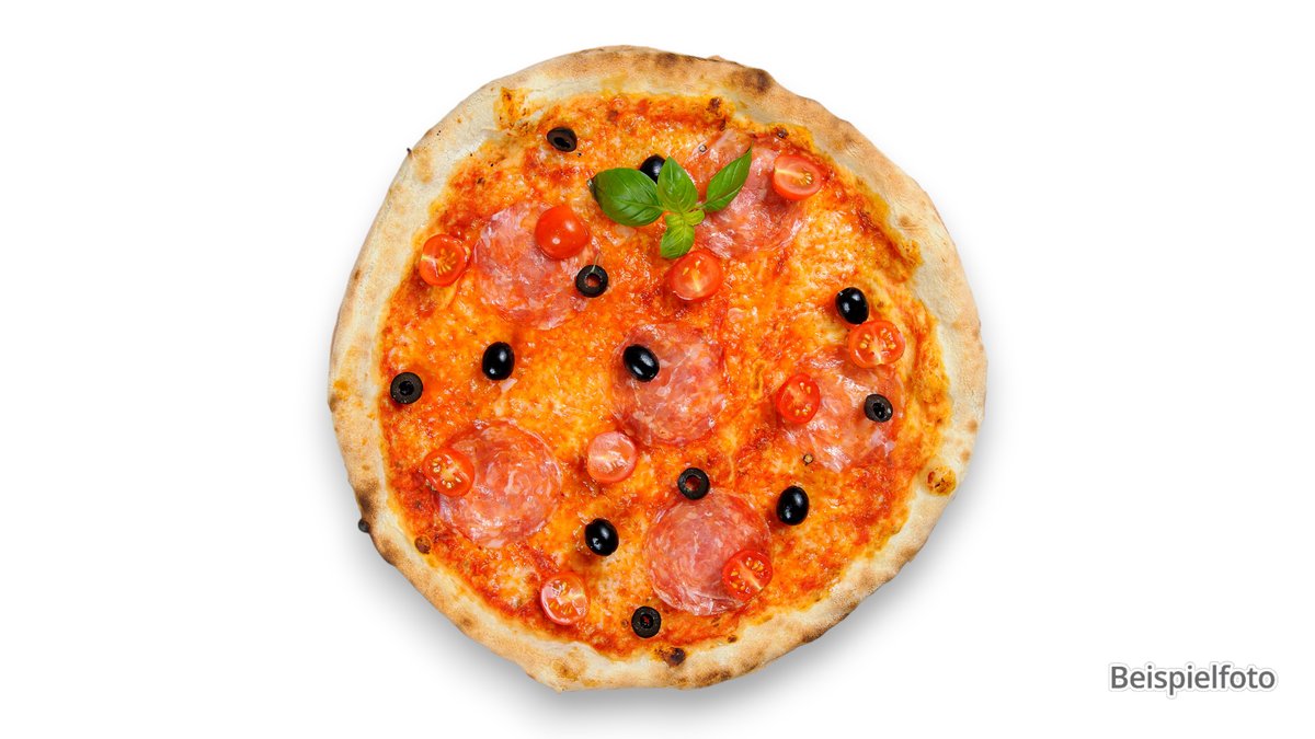 mit Tomatensoße, Mozzarella, Pepperoni-Salami von Pute, roten Zwiebeln und Oliven