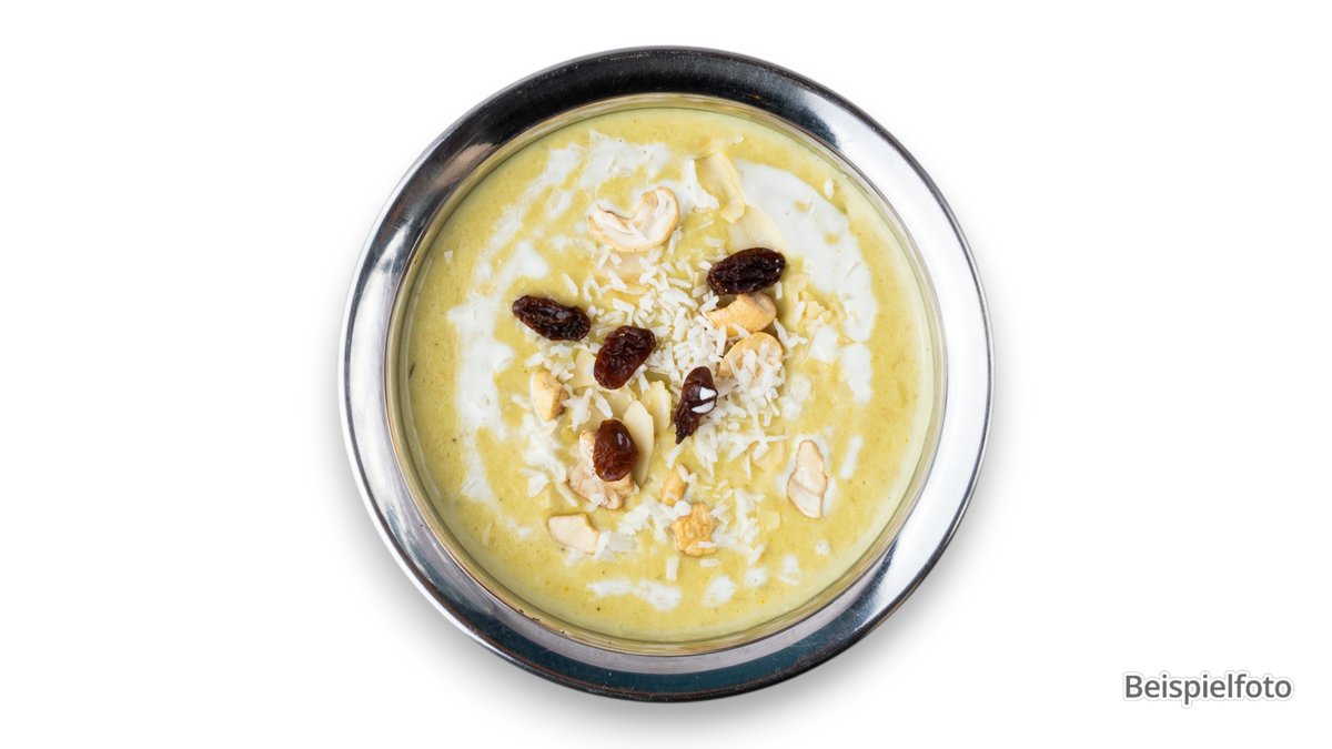 leichte vegetarische Kokoscreme-Suppe mit exotischen Alphanso-Mangos, LimettenblÀttern und Basilikum
