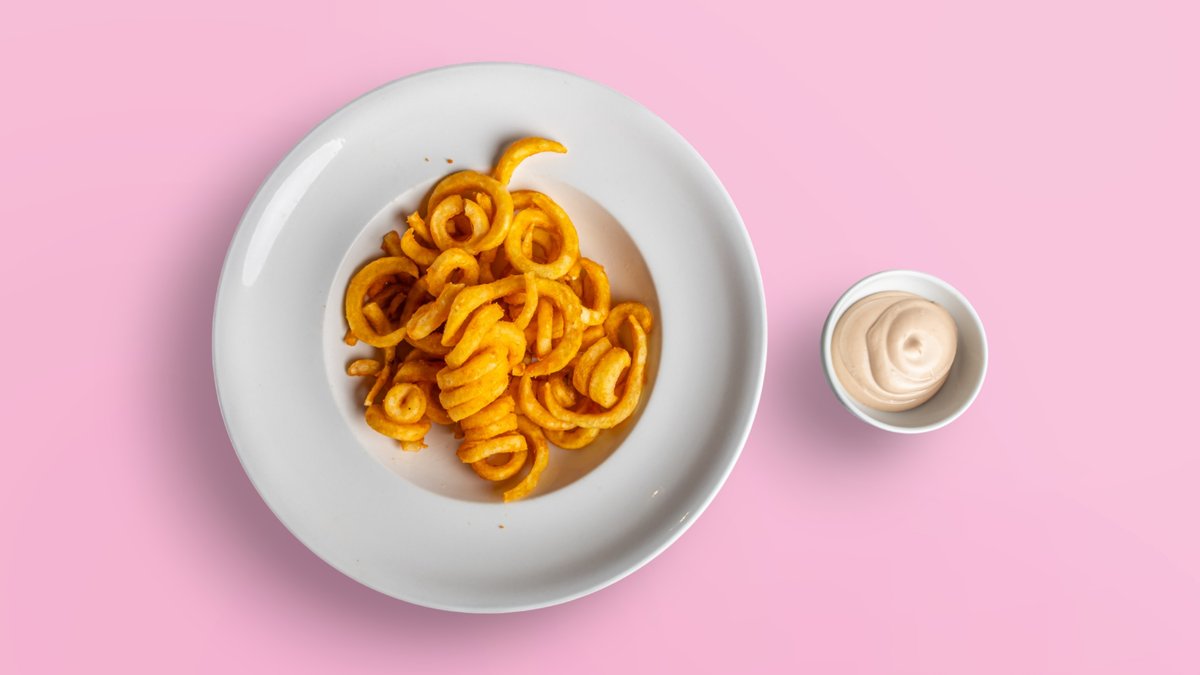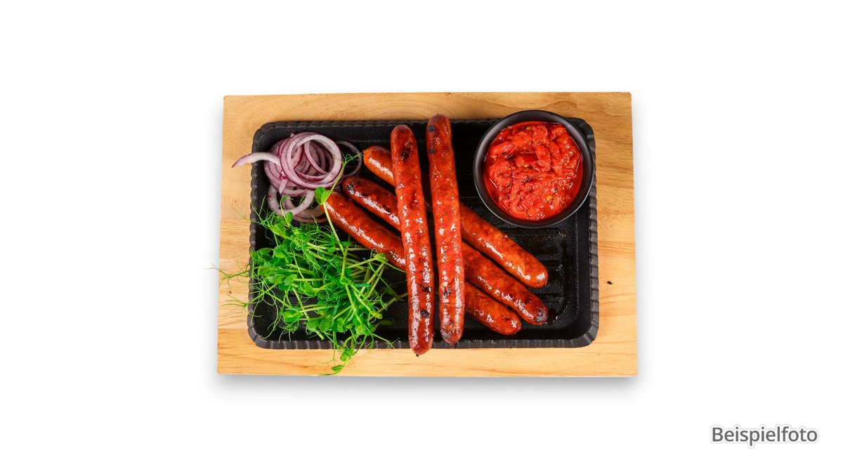 gegrilltes Wiener Würstchen vom Hähnchen mit Twister Fries, Sunny-Dip und würziger Tomatensoße