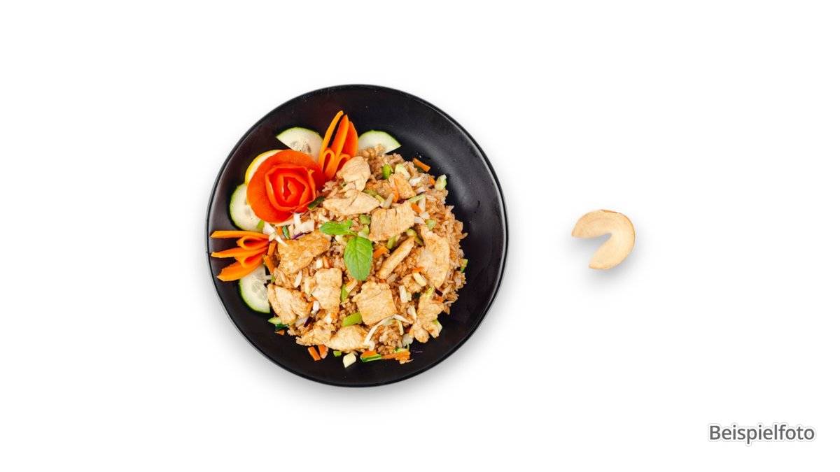 saftiges, mariniertes Hähnchenfleisch auf gelbem Kurkuma-Basmatireis
