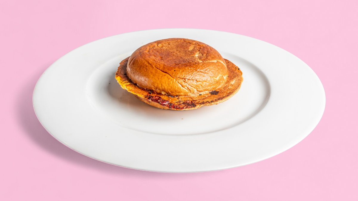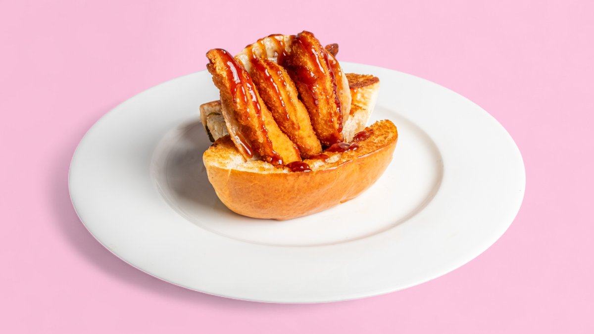 Brioche-Bun, belegt mit BBQ-Fried-Chicken, Gurkenrelish, geschmorten Zwiebeln und Mozzarella