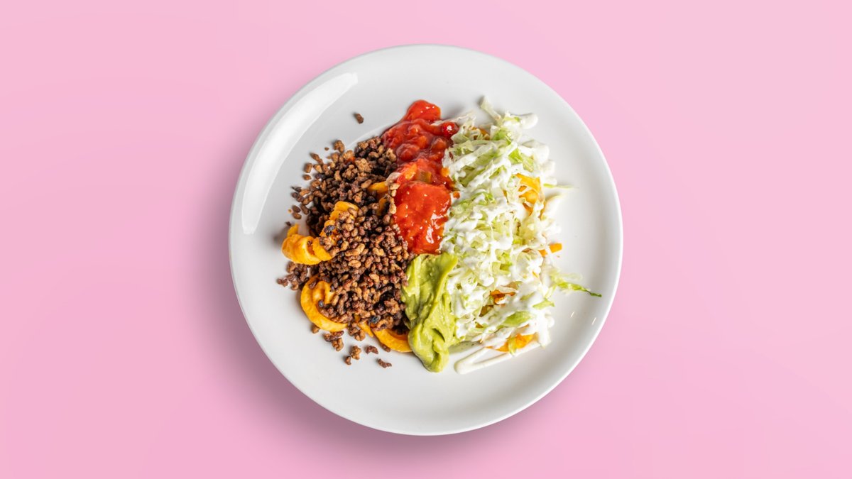 Twister Fries mit veganem Sonnenblumenhackfleisch, fruchtiger Salsa, Avocado, Salat und veganem Dressing