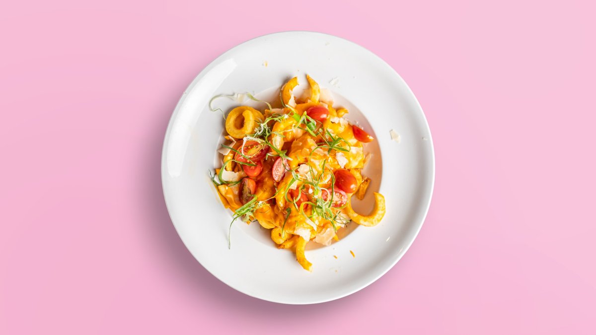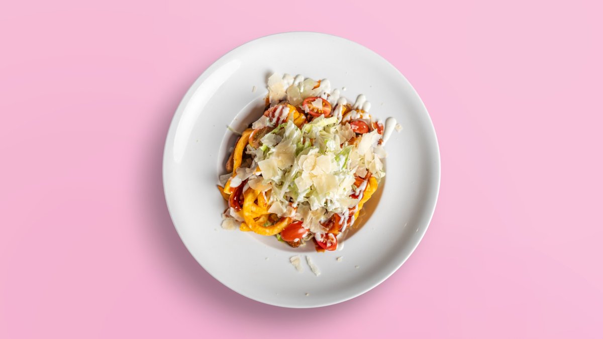 Twister Fries, beladen mit Cheddar-Soße, Kirschtomaten, Parmesan und Frühlingszwiebeln