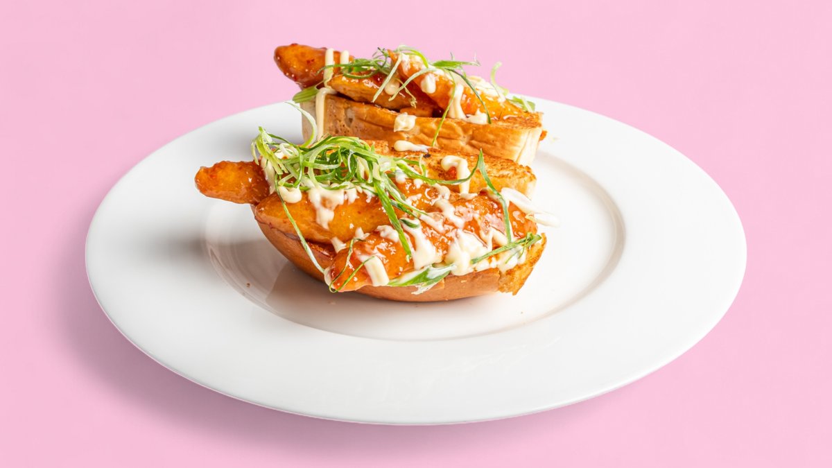 Brioche-Bun, belegt mit Korean Fried Chicken, hausgemachtem Kimchi, Lauchzwiebeln und japanischer Mayonnaise