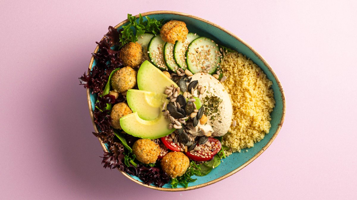 Falafel-Bällchen, Avocado, Kirschtomaten, Gurken, Rote Beete, Kichererbsen, Körnermix und Hummus