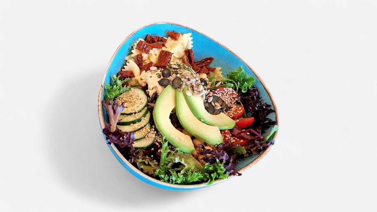 Farfalle-Nudeln mit getrockneten Tomaten, Avocado, Kirschtomaten, Gurken, Rote Beete, Kichererbsen, Körnermix, Sesam und Hummus