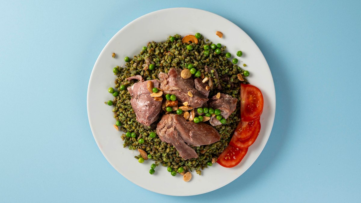 gerösteter grüner Weizen mit einer Fleischsorte deiner Wahl, Erdnüssen, Cashewkernen, Erbsen, einem frischen gemischten Salat und aromatischem Tsatsiki nach arabischer Art