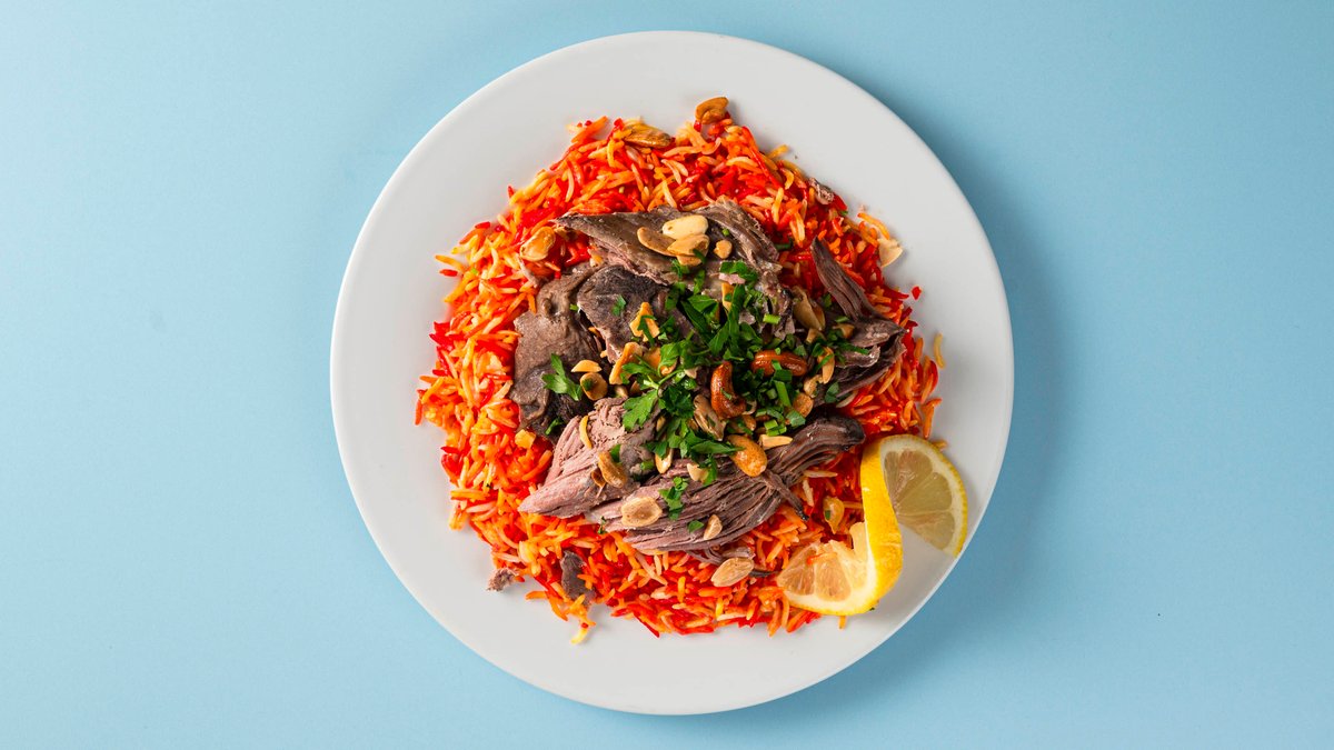 aromatisch gewürzter Reis mit einer Fleischsorte deiner Wahl, mit Cashewkernen, Mandeln, einem frischen gemischten Salat und aromatischem Tsatsiki nach arabischer Art