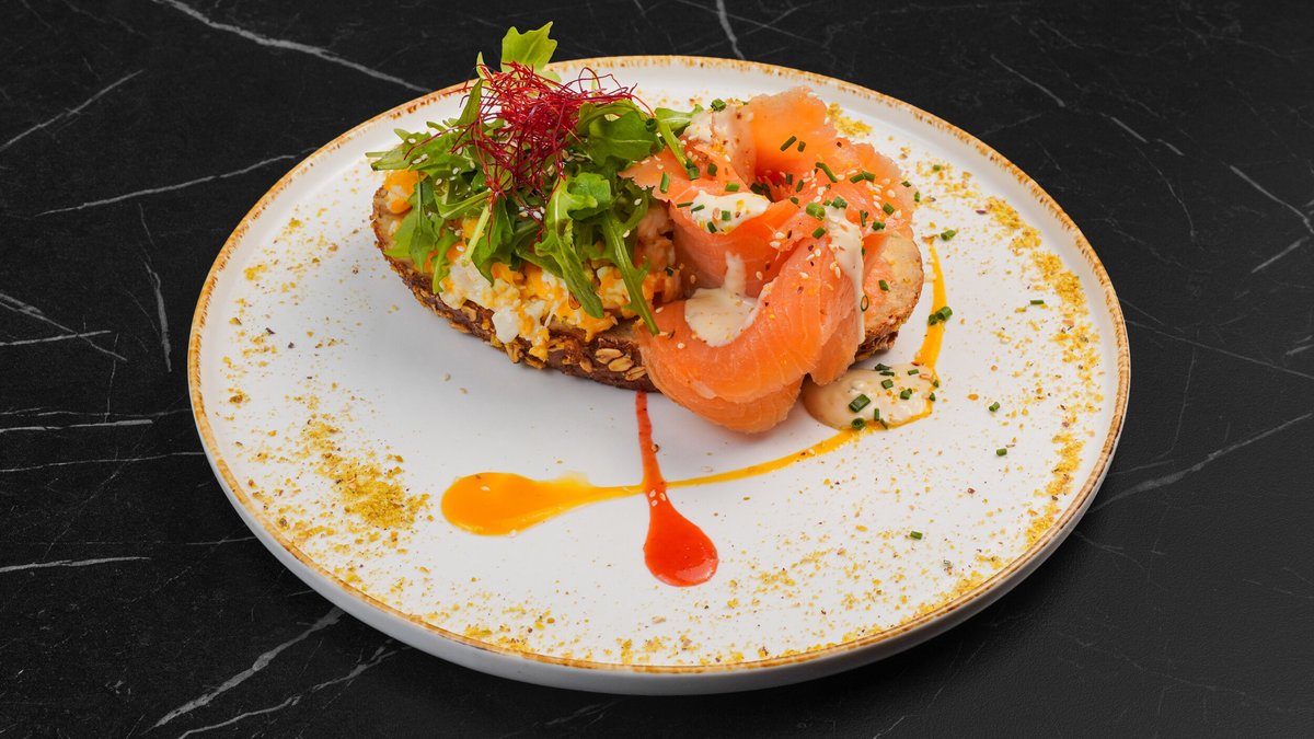 mit Hummus, geräuchertem Lachs, Rührei, Honig-Senf-Duett, Chili Flakes und Sesam