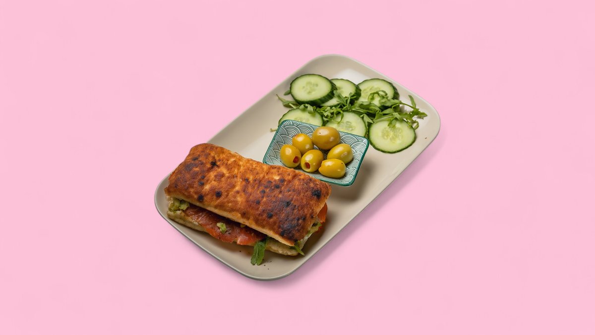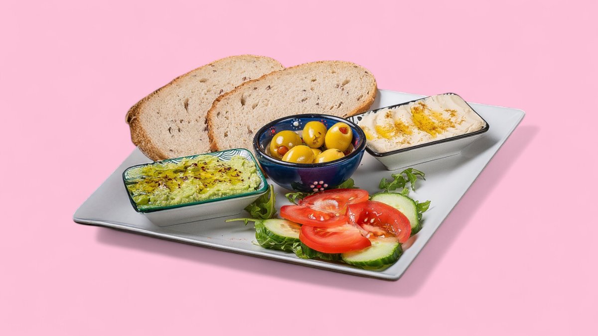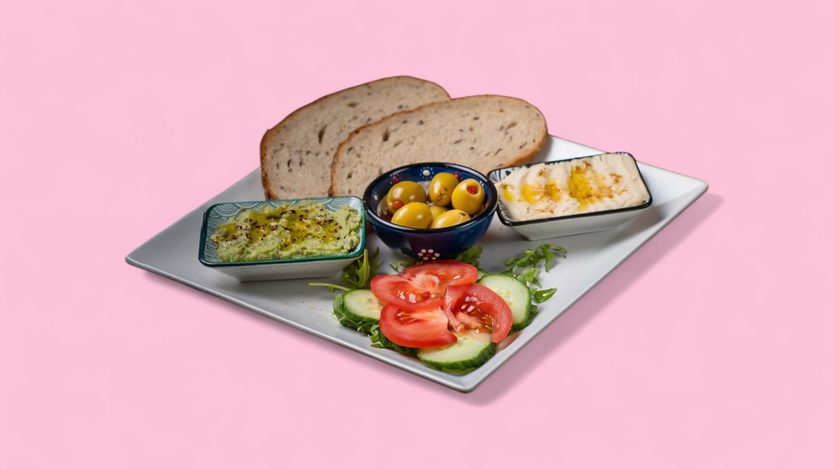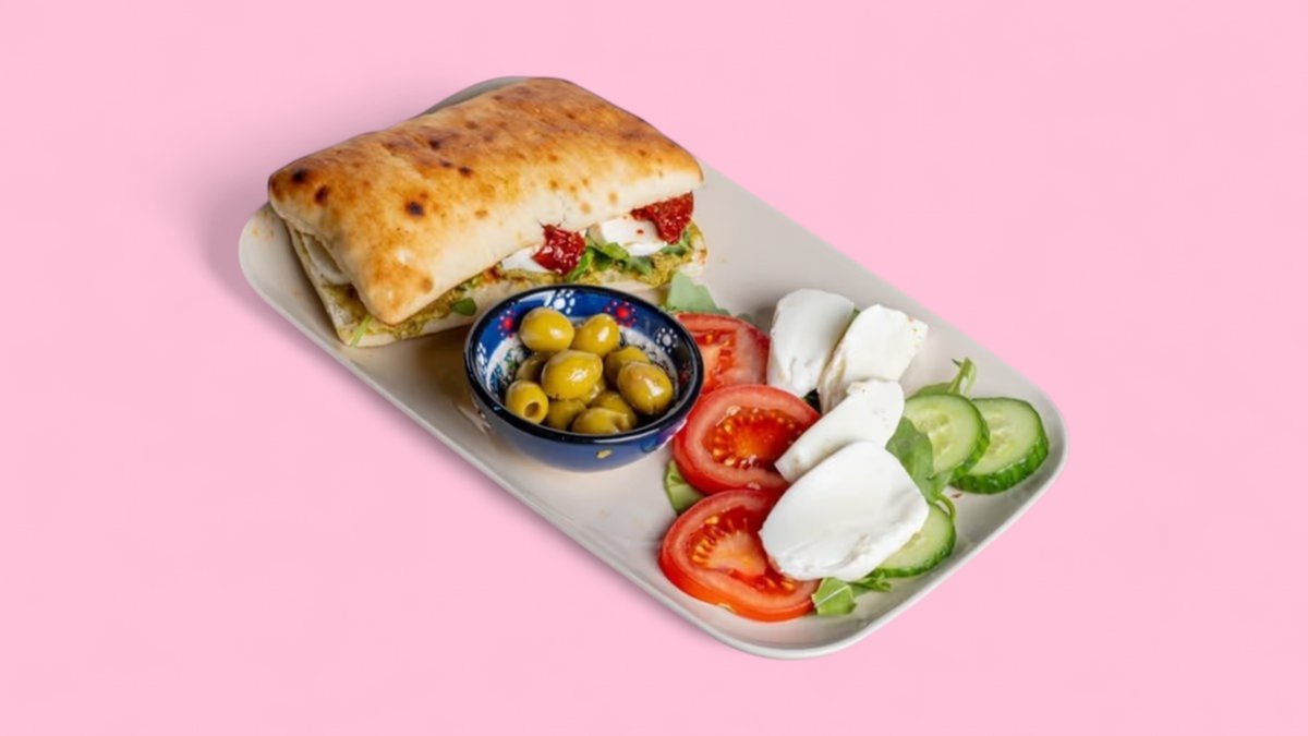 gegrillte Oliven, frische Tomaten, Gurken, Rucola und Pesto, serviert mit geröstetem Brot
