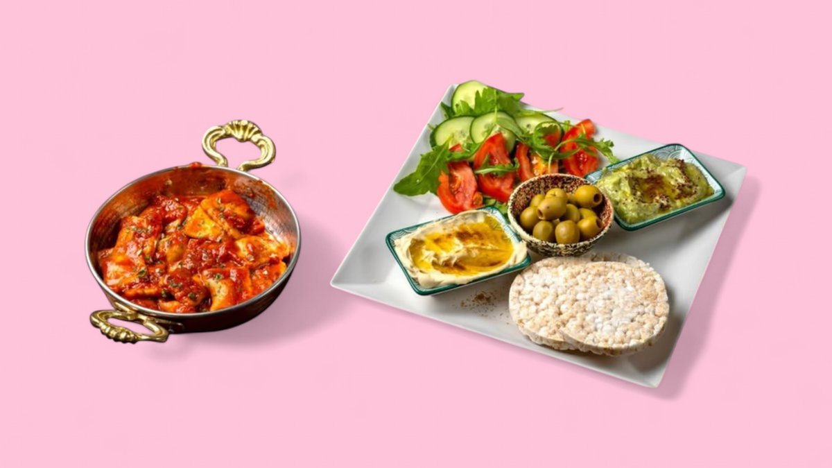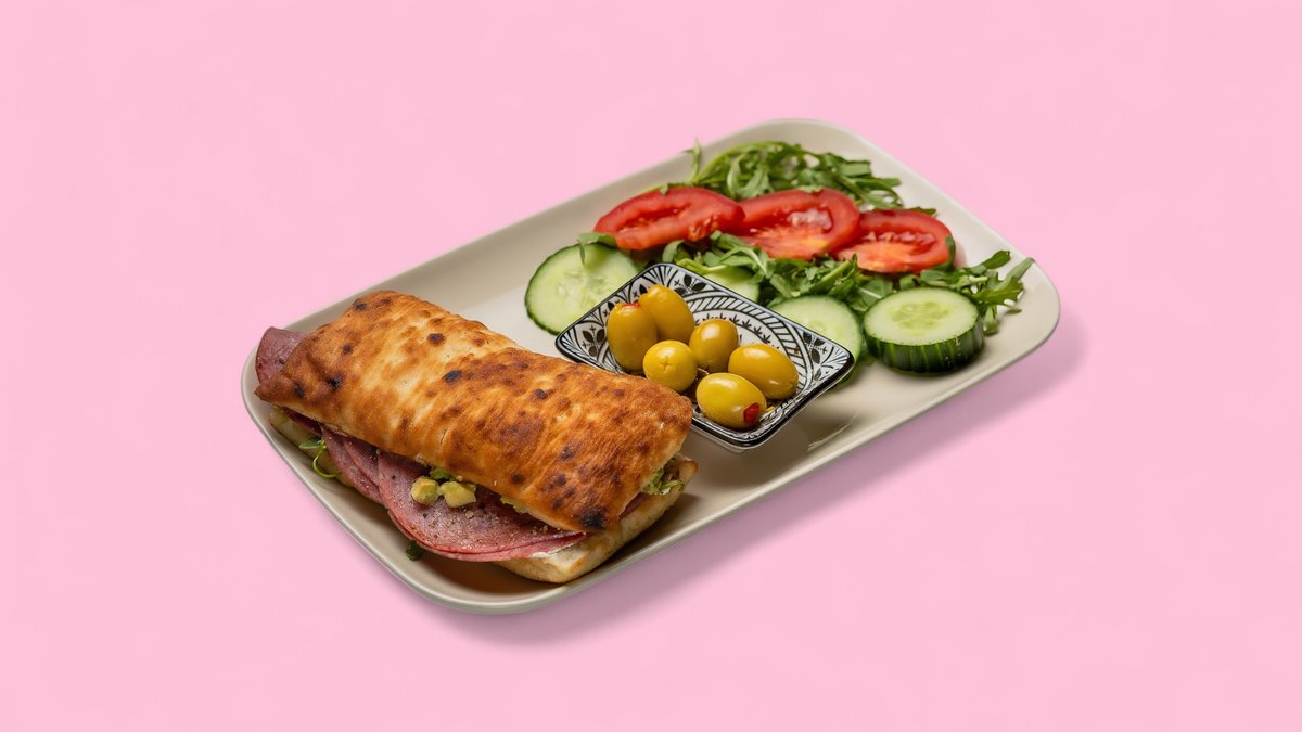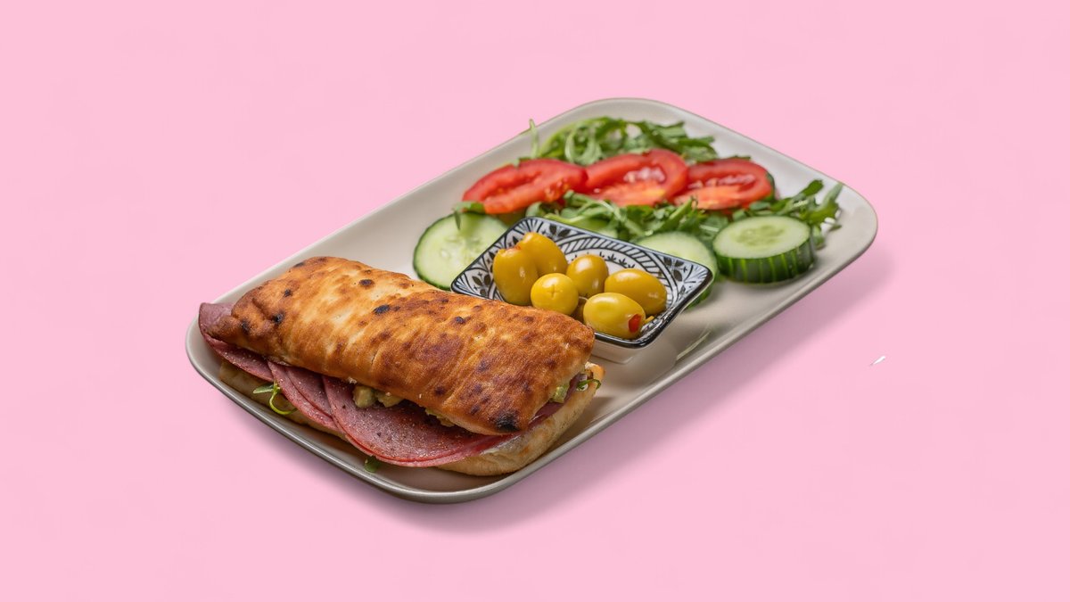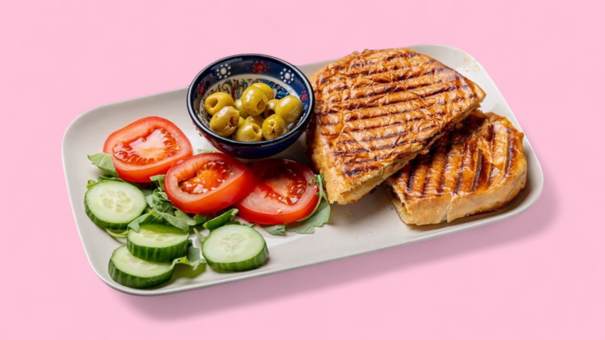 gegrillte Oliven, frische Tomaten, Gurken, Rucola und Pesto, serviert mit geröstetem Brot