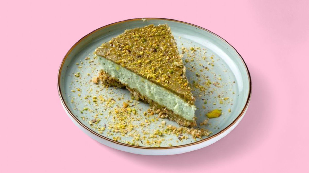 fein-cremiger Cheesecake mit Pistazienstücken, auf buttrigem Keksboden